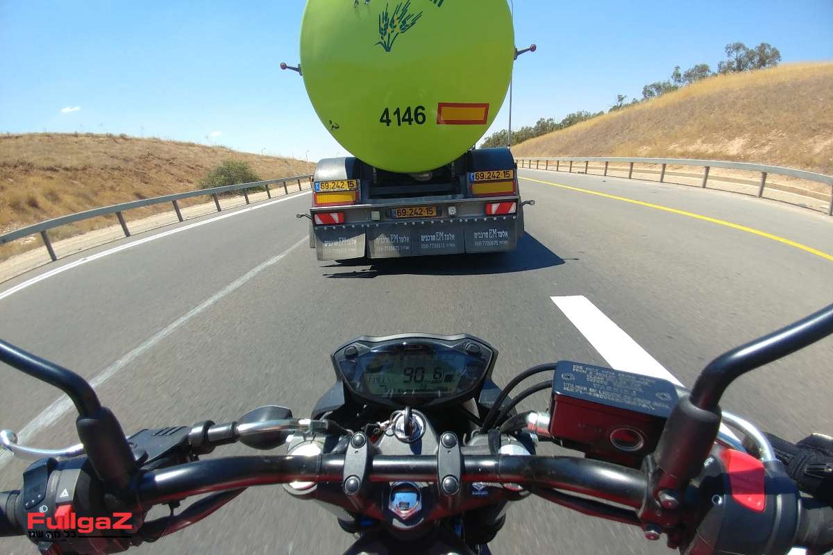התוצאה הייתה לא פחות ממדהימה. בזמן שרכבנו מאחורי המשאית, מד תצרוכת הדלק של ה-SV650 שלנו הראה את המקסימום שהוא יכול – 50 ק"מ/ל'. בפועל, תצרוכת הדלק הייתה אפילו טובה יותר, פשוט לוח השעונים של ה-SV650 לא מכיר תצרוכת כזו מפני שאין כזו בכל סוג של רכיבה 'רגילה'.