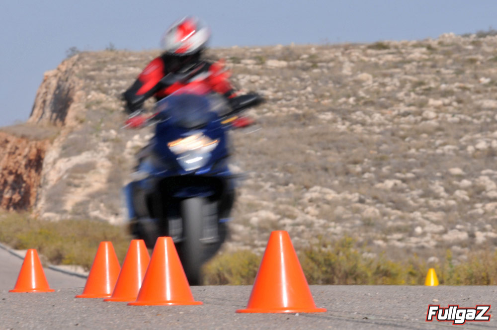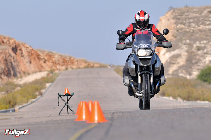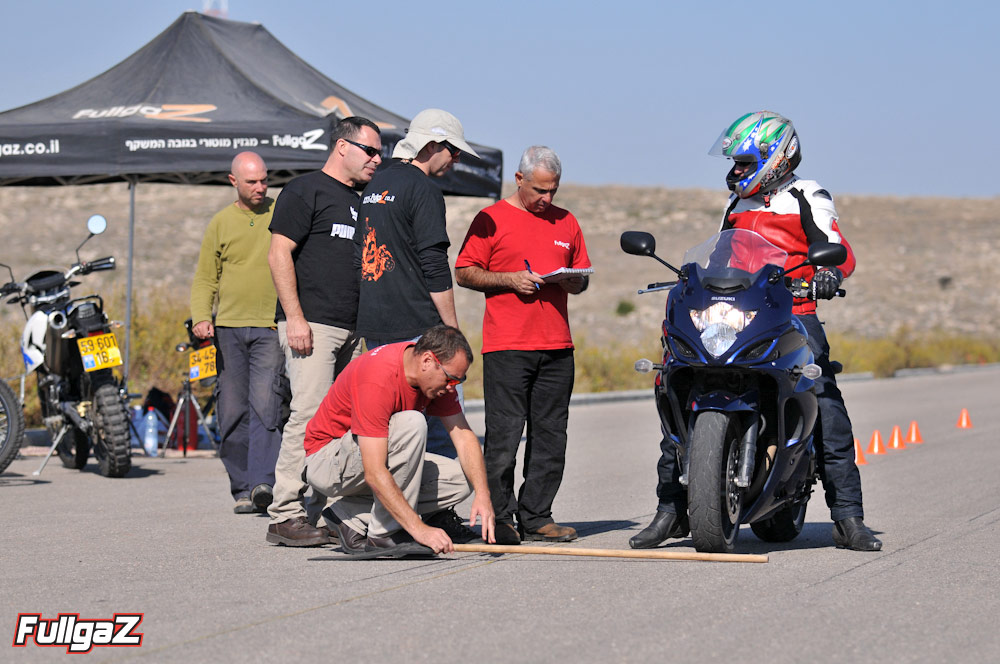 אלי מתחיל עם ה-R1200GS. החלק הראשון, בו הוא נדרש לבלום על ידי סחיטה הדרגתית של הבלמים, הוא קל יחסית. מה שלוקח לו קצת זמן זה להתרגל להגיע לנקודת הבלימה כל פעם ב-100 קמ"ש על פי ה-GPS ולא לבלום מוקדם מדי. בנוסף, בלימות שבהן הוא בולם חזק מדי ומפעיל את ה-ABS נפסלות (הוא גם מרגיש ומדווח על זה, וגם רואים ושומעים את זה מהצד); אנחנו מחפשים בלימה מקסימלית ללא השתלבות של ה-ABS. תוך מספר לא רב של בלימות שהולכות ומתקצרות, הוא מתייצב על מרחק בלימה אחיד בכל פעם, בלי 'תקתוקי' ה-ABS. ממוצע המרחק עומד על 43.6 מ'.