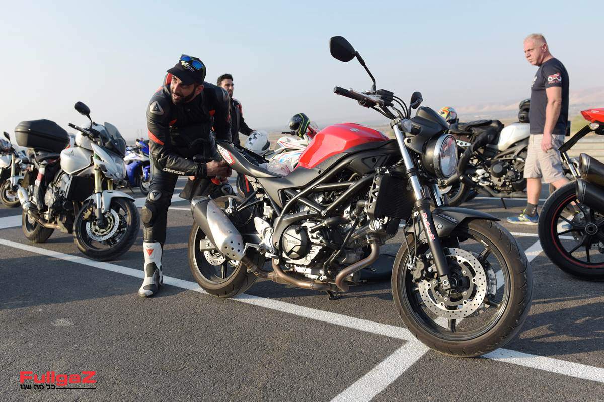כלי התחבורה שלי לאירוע היה לא אחר מאשר הסוזוקי SV650 שנמצא אצלנו במערכת במבחן ארוך טווח כבר 5 חודשים, כשהוא נועל צמיגי Mitas Force Sport (עליהם עוד נספר בהרחבה בפעם אחרת) שהורכבו לפני פחות מ-3,000 ק"מ. לנוכח הסיבה שלשמה התכנסנו – רכיבת מסלול, וגם בגלל שאני שוקל קצת יותר מאביעד שאצלו בילה האופנוע את מרבית התקופה, הקשחתי את עומס הקפיץ בבולם האחורי בשני קליקים; משן מס' 3 לשן מס' 5 (מתוך 7). מאחר וכבר פתחתי ארגז כלים, על הדרך גם פירקתי את המחרשה עם לוחית הרישוי ואת המראות. ההיגיון מאחורי זה עמד איפשהו בין מראה יותר נכון למסלול, לבין מחשבה על מזעור הנזק, על כל מקרה שלא יהיה. אחרי הכל, למסלול באים בשביל לאתגר קצת את השילוש הקדוש של רוכב-אופנוע-צמיגים (את האספלט לא מאתגרים, הוא אלוהי המסלול).