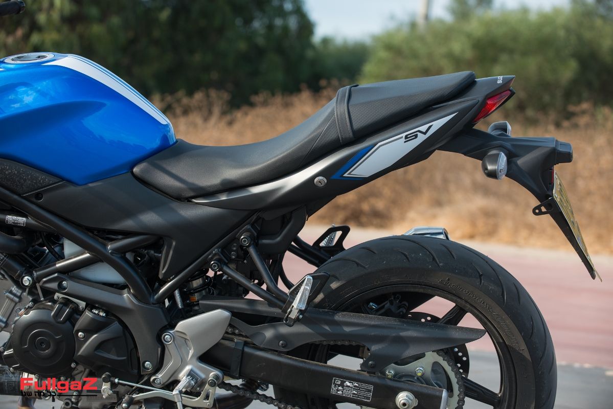חיסרון אחד גדול הוא מושב הרוכב, שמוטה כלפי מעלה בחלקו האחורי, גורם לרוכב להחליק קדימה אל המיכל ומפעיל לחץ על הירכיים. לאורך זמן זה מציק. הרגליות הגבוהות והמושב הנמוך יוצרים כיפוף בברכיים – לא מוגזם כשל אופנועי ספורט, אבל בהחלט יותר מכופף משל נייקדים מקבילים. בתמורה לזה מקבלים מרווח הטיה כמעט אינסופי. המורכבת דיווחה על מושב נוח מאוד, אם כי בסוזוקי לא ציידו את ה-SV בידיות מורכב – דבר תמוה למדי.