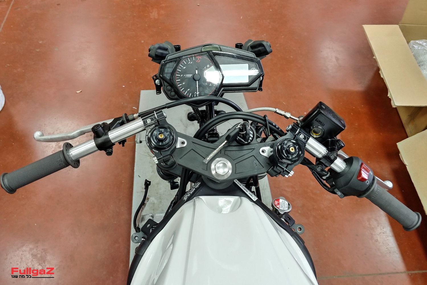 ראשית כיוונו את הקליפ-אונים כך שיהיו סימטריים ובזווית הנוחה לנו. לאחר מכן את מנופי הבלם והקלאץ'. משם עברנו לגובה רגליות ומנופי הבלם וההילוכים. הכל מהיר וענייני – מיועד לעבודה קלה ומהירה. רייסינג.