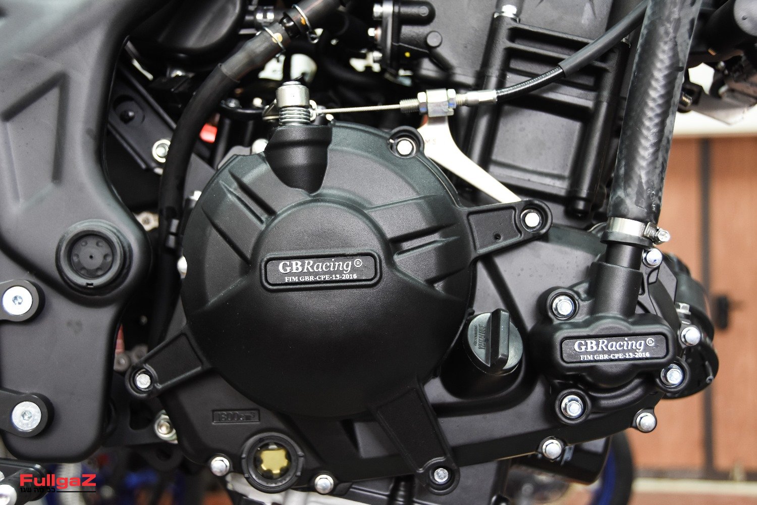 התחלנו בחלקים הקלים והרכבנו מגנים למכסי הקלאץ', משאבת המים והסלילים. המגנים של חברת GB Racing, עשויים מפלסטיק קשיח, יושבים על המכסים המקוריים ומתחברים עם ברגים ארוכים יותר שמגיעים עם המגנים. ההרכבה פשוטה ולקחה דקות ספורות. גם הסליידרים של R&G הורכבו בקלות והודקו במומנט של הבורג המקורי, וכך גם הספולים לזרוע האחורית.