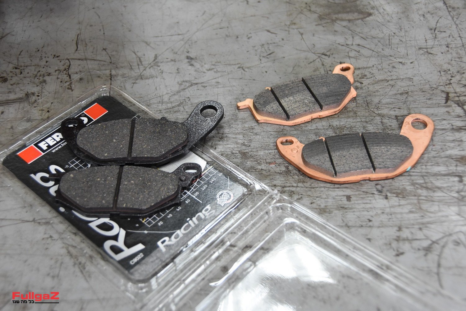 מכיוון שעדיין לא הרכבנו את הפרונט, והקליפר הקדמי היה תלוי לפנינו, ניצלנו את ההזדמנות כדי להחליף את רפידות הבלם הקדמיות לרפידות מרוצים של FERODO – שיעבדו יותר טוב בעומסי מסלול.