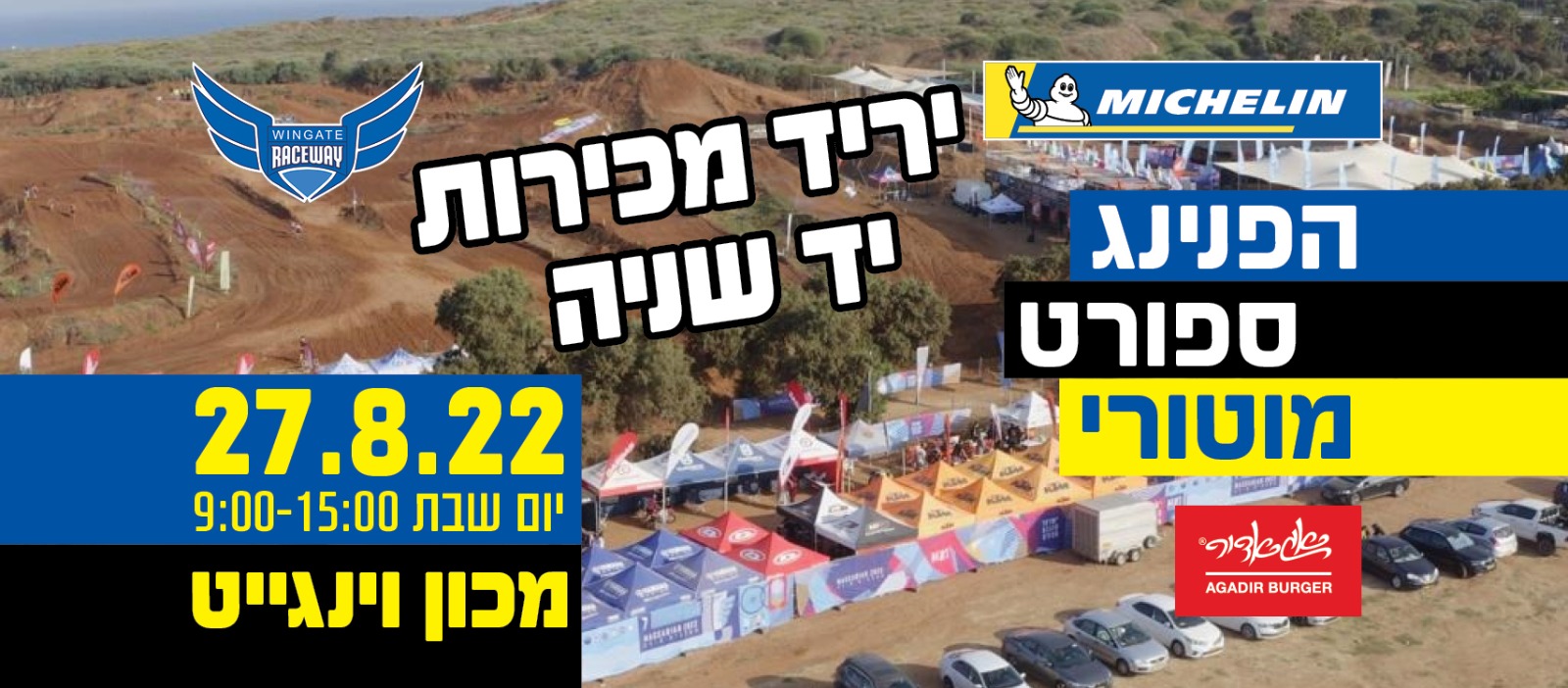 ביום שבת הקרוב, 27.8.22, החל מהשעה 09:00 בבוקר ועד 15:00 אחה"צ, יתקיים במסלול וינגייט הפנינג מכירות יד-שנייה, שבו רוכבים מוזמנים להציע למכירה את מרכולתם המשומשת – ציוד רכיבה, אביזרים שונים, חלקי חילוף לאופנועים וכו'. הפקת האירוע תדאג למקומות מוצלים לטובת המוכרים והקונים.