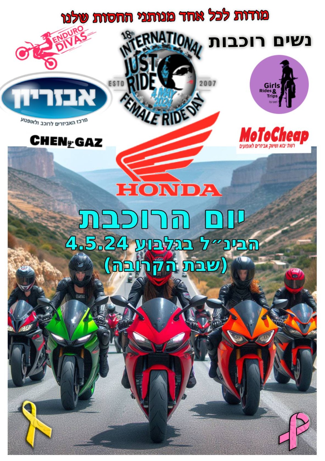 רוכבות דו-גלגלי מוזמנות להגיע לאירוע. העלות: 110 ש"ח למשתתפת.