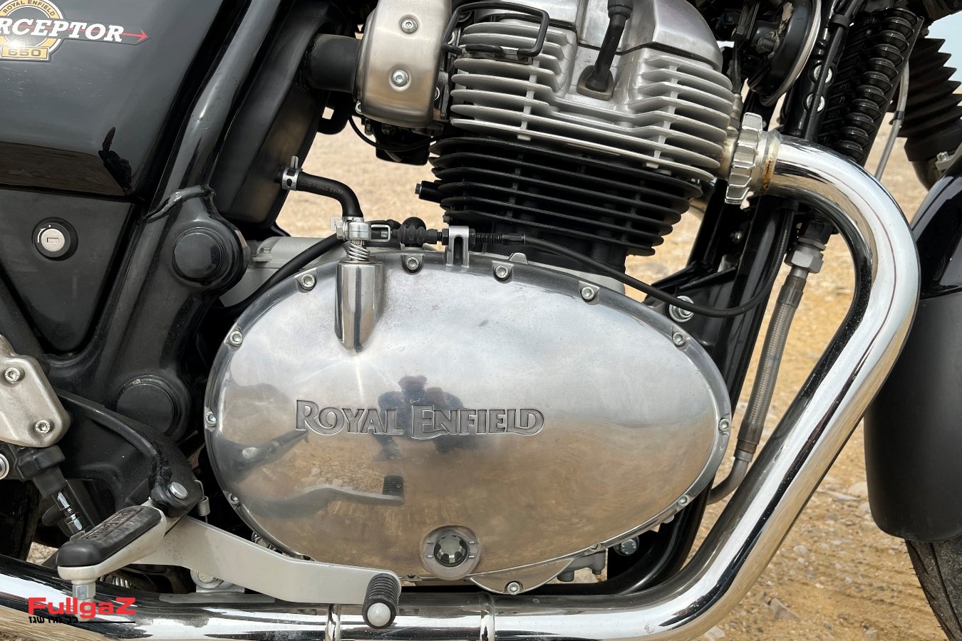 אופנוע המבחן בצבעי שחור-אדום, וההתרשמות הראשונית חיובית מאוד – איכות הצביעה וההרכבה טובות מאוד, ובהחלט בנות השוואה לכלים יקרים יותר. לחיצה על המתנע החשמלי מעירה מיד את המנוע, אשר פולט גרגור ערב לאוזן דרך צמד המפלטים המבריקים. בניגוד להרבה מנועים מודרניים, מנועו של האנפילד משמיע רעש מכאני עדין אך נוכח – ומזכיר בכך קצת כלים יפניים מתחילת שנות ה-90. המושב נמוך, רך במידה, תומך ומזמין. בהרמה מהרגלית האופנוע נותן תחושה שהוא מעט כבד לגודלו – אך לא במידה שתאיים על רוכב מתחיל או נמוך מהממוצע. בנוסף לרגלית צד מצויד האינטרספטור גם ברגלית אמצע – עוד ג'סטה של מהנדסי רויאל אנפילד לרוכב שמתכוון לתחזק את האופנוע בתנאים ביתיים.