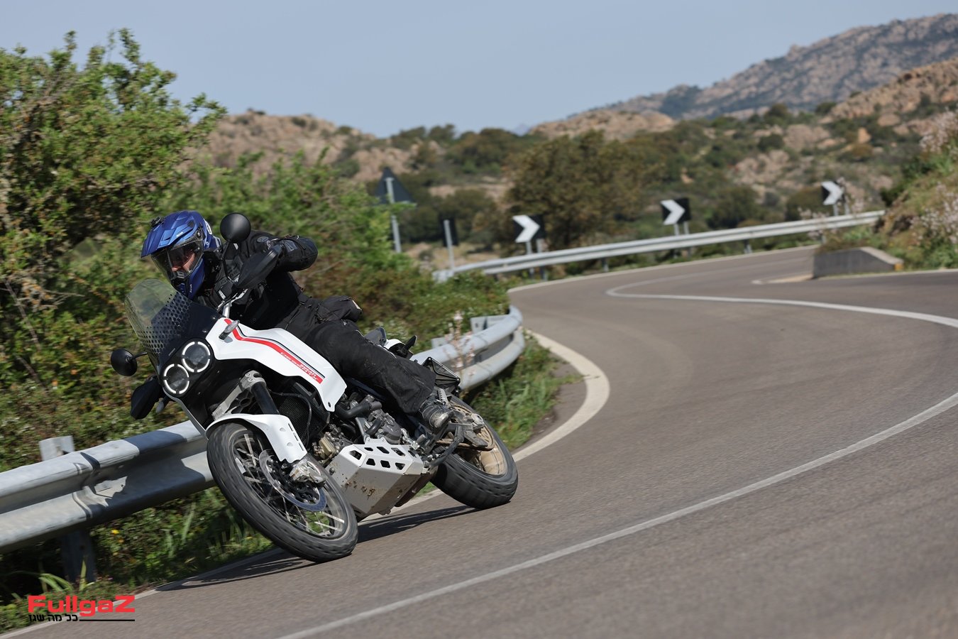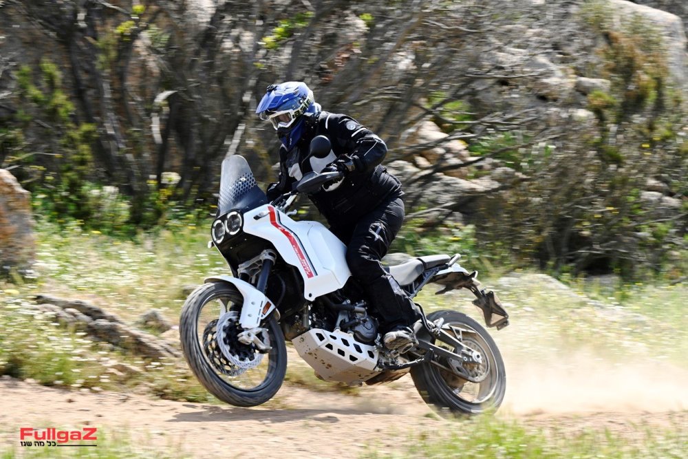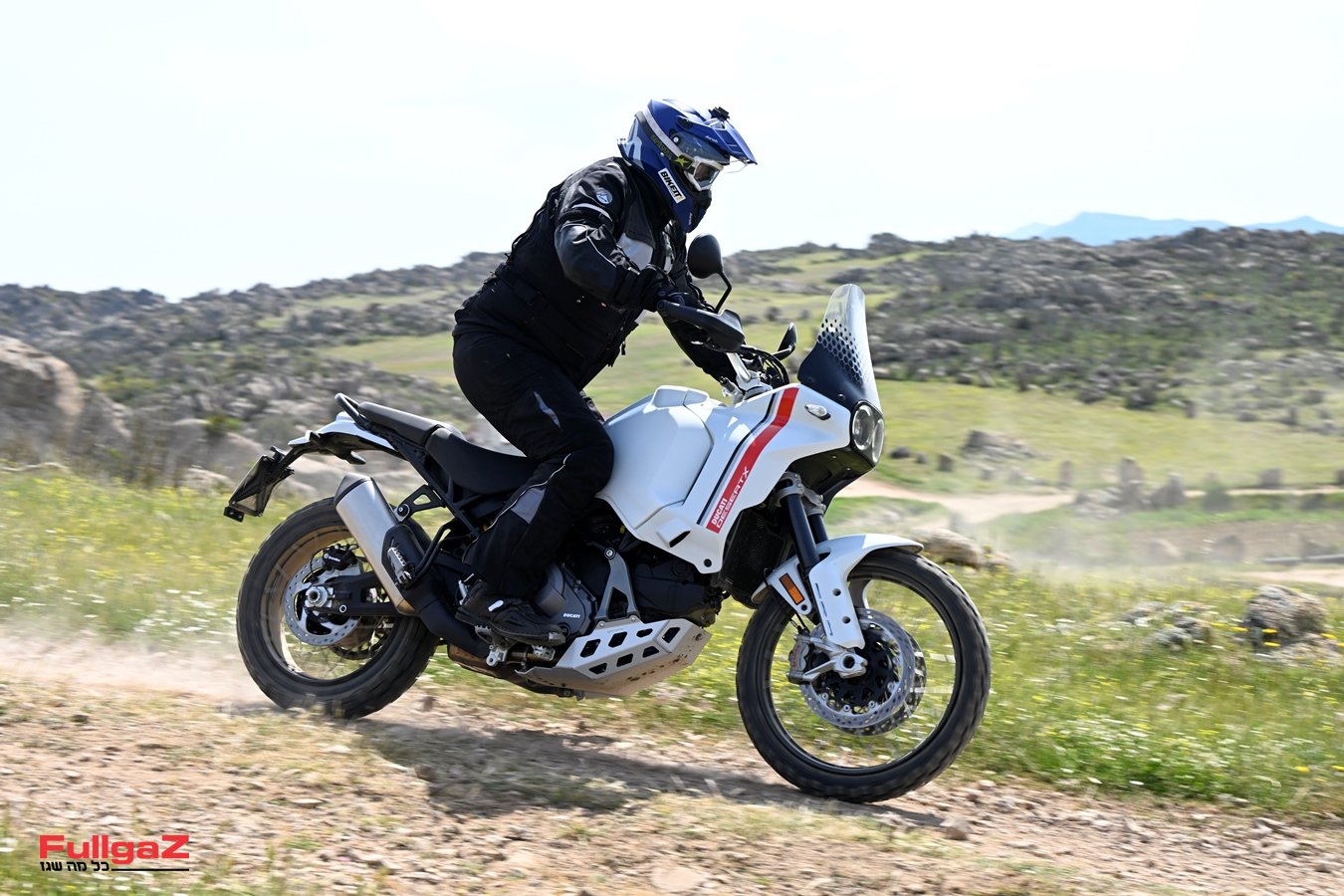 כל המחמאות ממשיכות גם לכביש. השליטה, הנוחות, היציבות – כל זה קיים גם שם. מערכות ניהול המנוע מאפשרות את המעבר בין 75 כ"ס מוגבלים במצב גשם, ל-95 כ"ס במצב עיר, לכל ה-110 כ"ס במצב כביש והוספת תגובת מצערת מהירה במצב ספורט. הגנים של דוקאטי בהחלט באים לידי ביטוי בכבישי ההרים המפותלים מצפון לסרדיניה, ולא מופרעים מקוטר החישוק הקדמי. הבלמים, ברמבו עם קליפרים M50 בעלי ארבע בוכנות, מספקים יכולת גבוהה ותגובה מיידית, ללא כל התעייפות. הכידון מסובב מעט קדימה לשימוש במצב עמידה בשטח, וגילינו שזה מעייף את הזרועות ברכיבת כביש ארוכה. ניתן כמובן למצוא את האיזון בין שני המצבים.