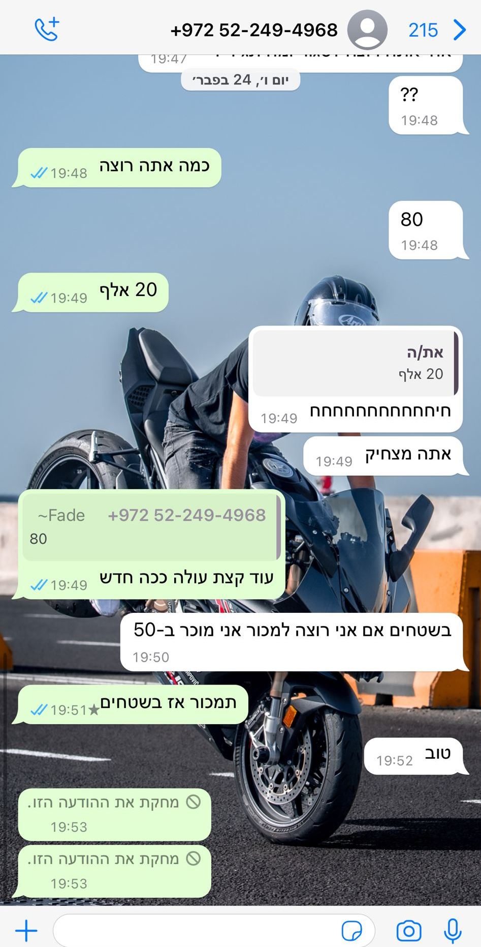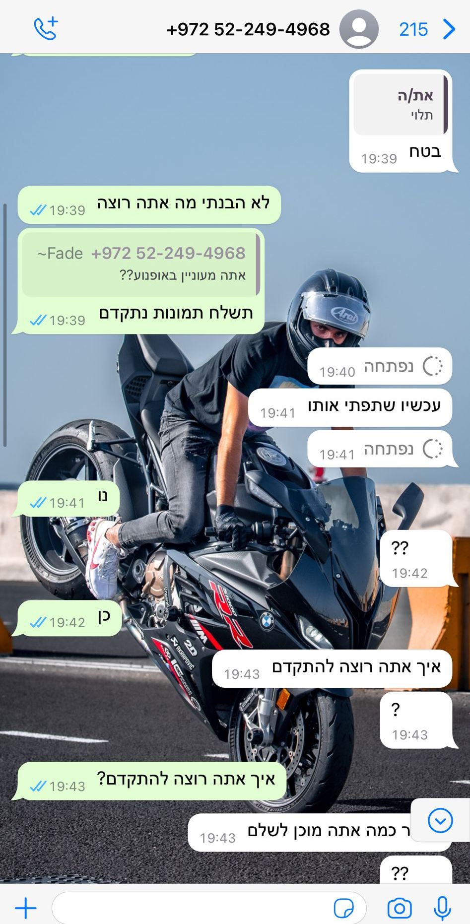 ועכשיו לסיפור של ידין טל מפתח תקווה, שבבעלותו ב.מ.וו S 1000 RR ספורטיבי, נדיר ויקר, לאחר שקם בבוקר והתממש הסיוט הגדול ביותר של כל בעל אופנוע – לגלות שהוא לא נמצא. הוא פנה למשטרת ישראל והגיש תלונה, וכבר אז אמרו לו שאם הכלי הגיע לשטחים – אין למשטרה יכולת לסייע בכך. אין להם סמכות לטיפול בכל מה שמעבר לקו הירוק. מספר ימים לאחר מכן הוא קיבל הודעות לוואטסאפ, עם תמונות של האופנוע ותחילת משא ומתן לתשלום כופר בסכומים שמתחילים ב-70 אלף ש"ח, ובתמורה יוחזר לו האופנוע.