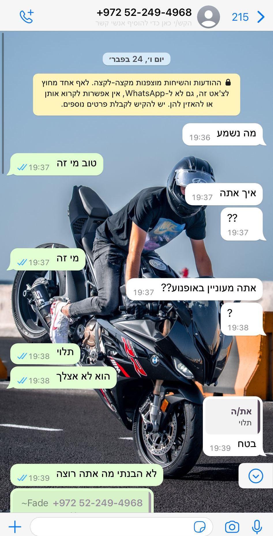 לא ידעתי איך להמשיך מפה, מי שמכיר אותי יודע כמה קשה אני עובד בשביל הדברים ואני משיג אותם רק בדרכים ישרות, לקח לי שנים להגיע למצב הזה, להשיג את האופנוע שבאמת רציתי, אבל אז יש הורים שמחליטים להביא ילד בן ז*נה שכל מה שהוא יודע זה לגנוב מאחרים, כי ככה חינכו אותו, לעבור את המחסום להיכנס לכמה שעות לשטחי ישראל, בלי שהמשטרה / צבא בודקת אותם. ולקחת רכוש של יהודים, כן, הם אפילו לא רצו להחזיר את האופנוע בגלל שהוא שייך למישהו יהודי (אני).