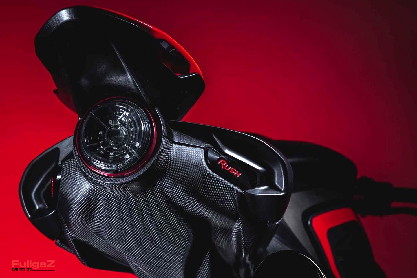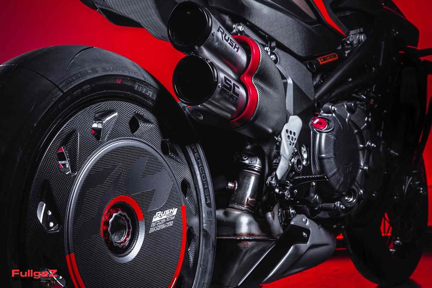 הסיפור המרכזי ב-RUSH 1000, כפי שאתם רואים, הוא העיצוב. שימו לב לחיפויי הקרבון שעוטפים את השלדה והרדיאטור, לרביעיית אגזוזי SC-Project, לזרוע האחורית החד-צדית, לחיפוי האווירודינמי של הגלגל האחורי וליחידת התאורה הקדמית שמעניקה לו אופי אחר לגמרי מהברוטאלה עליו הוא מבוסס.