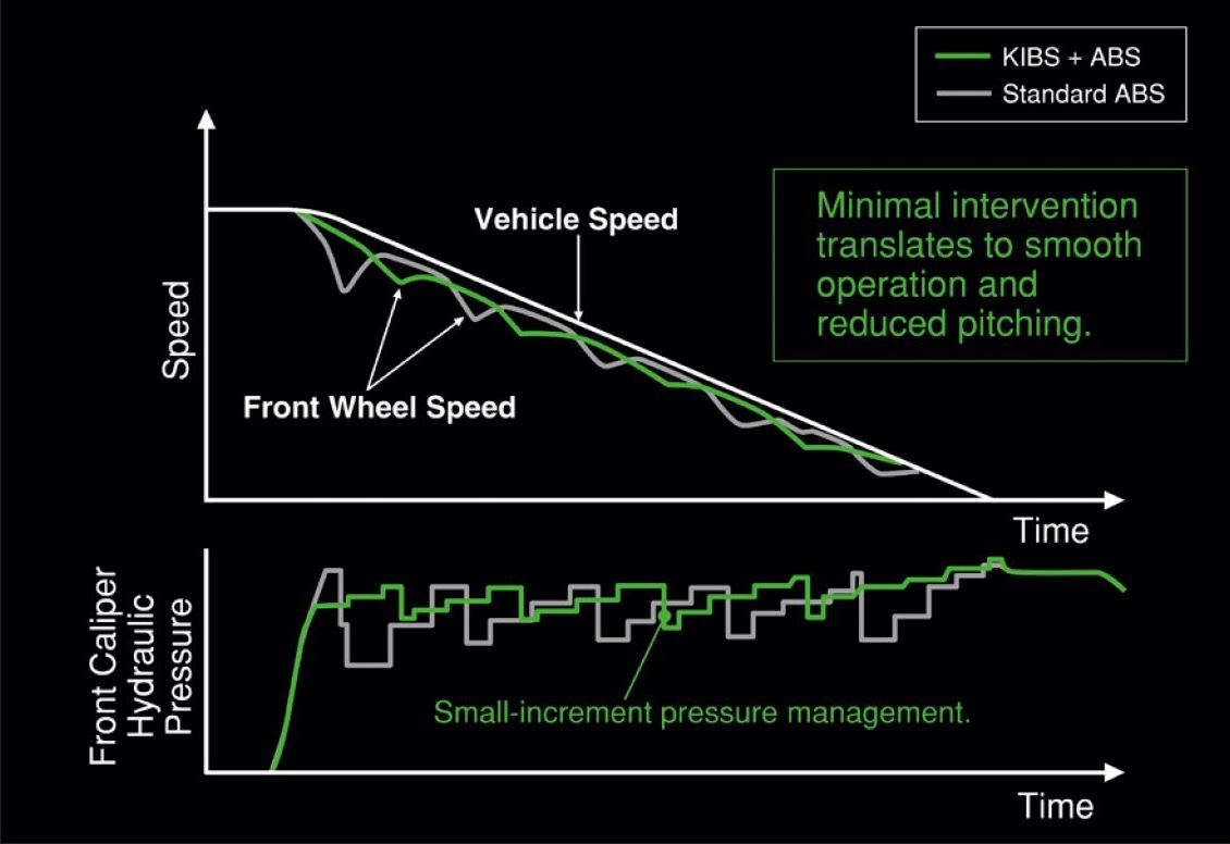 מערכת ABS (ר"ת Antilock Brake System) – מערכת למניעת נעילת גלגלים בבלימה. המערכת מחולקת למחשב ולמודולטור – בית שסתומים. חיישני מהירות על הגלגלים מדווחים למחשב מה מהירותו של כל גלגל, וכאשר תחת בלימה אחד הגלגלים מאט משמעותית או נעצר לגמרי, כלומר מחליק, המחשב, דרך המודולטור, משחרר לחצים מקו צינור הבלם של אותו גלגל בתדירות של עשרות פעמים בשנייה ובכך מונע את נעילת הגלגל. חיישני ה-IMU יודעים לקחת בחשבון גם מצב בו האופנוע נמצא בהטיה, שם יש פחות שטח מגע של הצמיג בקרקע, להעביר את המידע ולווסת את ה-ABS בהתאם.