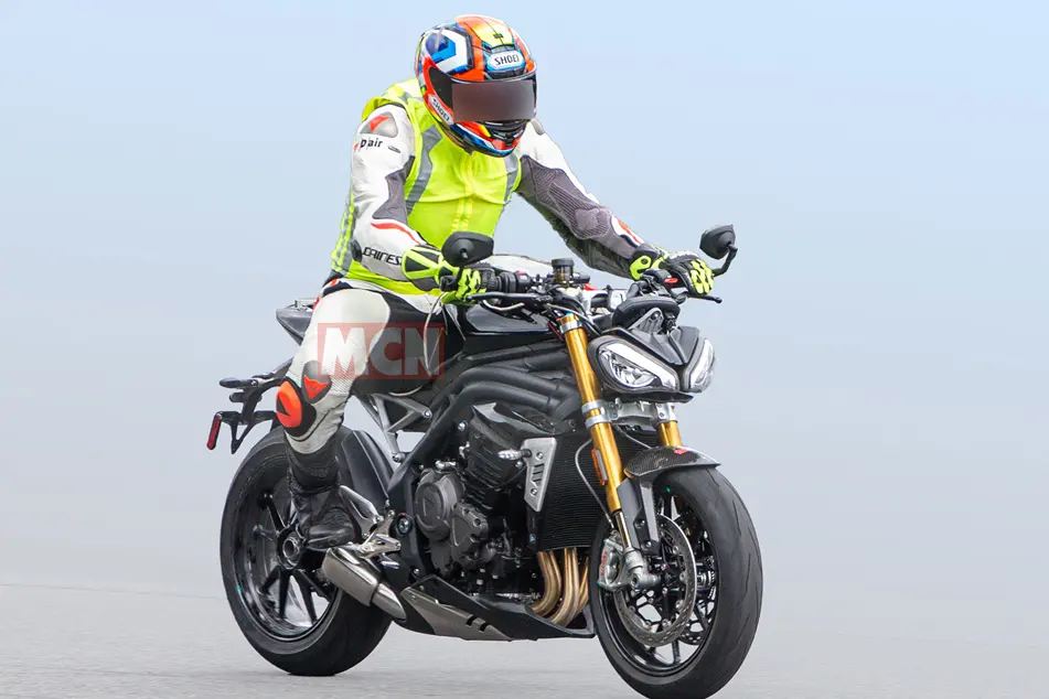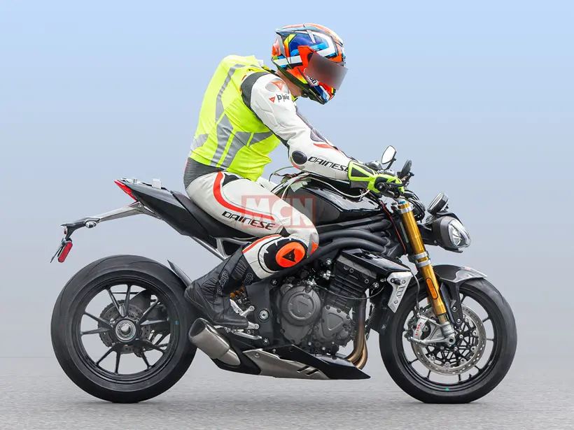 הספיד טריפל של טריומף מספק כיום ממנוע הטריפל בנפח 1,050 סמ"ק 148 כ"ס. בהחלט מכובדים, אך בטח לא עומדים מול המתחרים מאירופה ובראשם דוקאטי סטריטפייטר V4, אפריליה טואונו וק.ט.מ 1290 סופר דיוק R. תמונות 'ריגול' חשפו דגם חדש לסופר-נייקד שבו ככל הנראה ישודרג מנוע הטריפל ל-1,200 סמ"ק, ויפיק כ-180-175 כ"ס. הדגם בתמונות נושא בולמי אוהלינס מתכווננים, כשהבולם האחורי מחובר ישירות לזרוע האחורית ללא לינק. יש גם בלמי ברמבו, ומערכת הפליטה יורדת מהזנב לחלקו התחתון של המנוע.