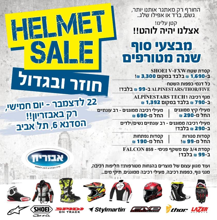ביום חמישי הקרוב, 22.12.16, בין השעות 22:00-16:00, תערוך רשת האביזרים 'אבזריון' הפנינג מכירות לסיום שנת 2016 – Helmet Sale. הפנינג המכירות ייערך בסניף הראשי של אבזריון ברח' הסדנא 6, תל-אביב.
