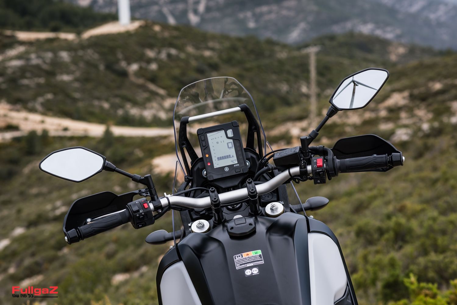 האבזור, כאמור, גם הוא פונקציונלי. יש מגן מנוע מאלומיניום ומגני ידיים מפלסטיק, יש שקע 12V, הכידון העבה שטוח ורחב – כמו של אופנועי אנדורו וראלי, ויש לוח שעונים מלבני שיושב גבוה ומציג את הנתונים החשובים בלבד (מהירות, מד מצטבר, מד מתאפס, תצרוכת דלק, טמפ' אוויר, תצוגת הילוך ונורות אזהרה).