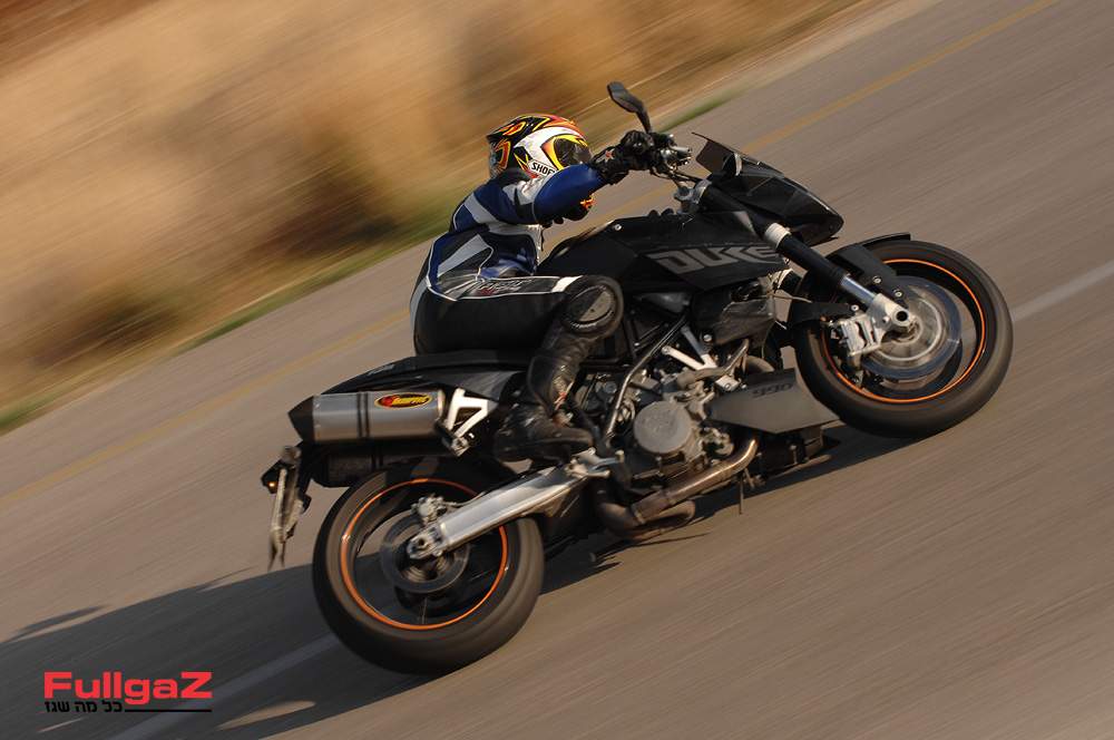 על הצד האופנוע מרגיש מצוין. בבסיסו הסופר דיוק לא ממש זריז, ונוטה יותר להיות יציב. בטח כי זה טוב לווילי'ז ארוכים. יחד עם זאת, הכידון הרחב לא מאפשר לכלי יותר מדי משא ומתן, ומפיל את האופנוע להטיה בזריזות רבה. שם, כשמשחררים את הכידון בשקט, שוב מרגישים את היציבות של האופנוע. וכשיוצאים מהפנייה עם הרבה גז מגלים שכמו כל ק.ט.מ – שם הוא מרגיש בבית. כשיש גז, והרבה. תנו לו קדמי להיגוי, ומאותו הרגע הוא רוכב על האחורי, ולפעמים גם במשמעות כפולה. כמו שאר מכלולי השלדה, גם הבלמים פה משובחים. הקדמיים, רדיאליים גם בקליפר וגם במשאבה, מרגישים אמנם קצת קשים, אולם העוצמה והרגש מהטובים שיש, וגם הם תורמים לא מעט למקדם החוליגניות של האופנוע. על הרכבה אין ממש מה לדבר. זה אמנם אפשרי טכנית כי יש שם מאחור פיסת מושב וגם צמד רגליות, אולם למורכב לא צפויים חיים קלים. זה נוח בדיוק כמו להיות מורכב על כנף אחורית של F16.
