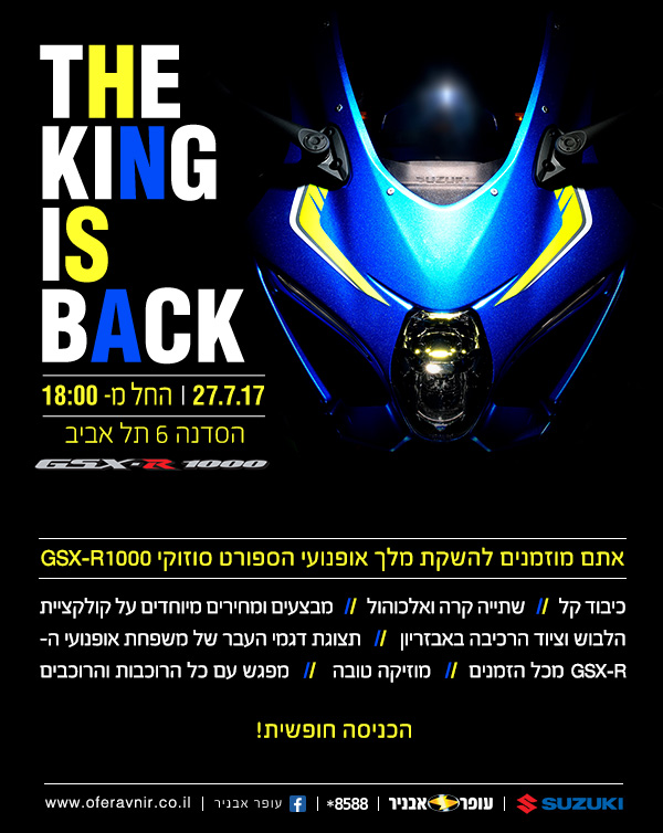 עופר-אבניר מזמינה את קהל הרוכבים למסיבת החשיפה של הסוזוקי GSX-R1000 החדש שהגיע ארצה לאחרונה.