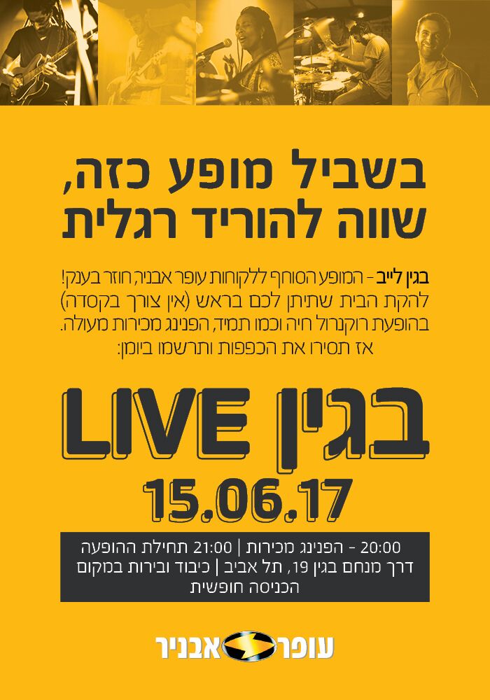 בחמישי הקרוב, 15.6.17, בין השעות 20:00-22:00 – אירוע בגין LIVE של עופר-אבניר – אירוע שכולו חוויה, מוזיקה וחברים.