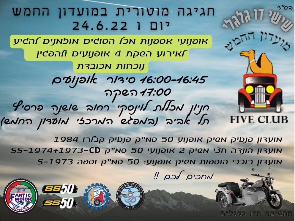 מחר, יום שישי 24.06.22, בשעה 17:00, יתקיים בתל אביב אירוע של מועדון החמש שבו ישיקו ארבעה אופנועים משופצים.
