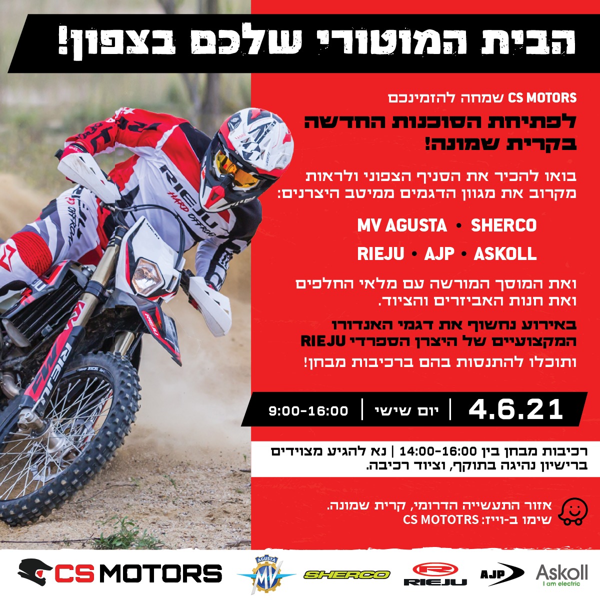 מחר (שישי) תיערך הפתיחה הרשמית של הסוכנות החדשה, החל מ-09:00 בבוקר ועד 16:00 אחה"צ. תהיה תצוגה של אופנועי שרקו, רייחו, AJP ו-MV אגוסטה, וניתן יהיה לבצע רכיבות מבחן על דגמי רייחו החדשים – MR RACING, MR PRO ו-RANGER (יש צורך ברישיון נהיגה בתוקף ובקסדה). בנוסף, לקהל הרוכבים שיגיע יוגש כיבוד.