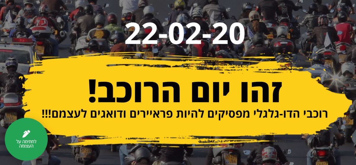 לקראת הבחירות לכנסת שיתקיימו ב-2 במרץ, יש מי מבין קהילת הרוכבים שמנצל את ההזדמנות כדי לרתום את חברי הכנסת לאינטרסים של אחד המגזרים המופלים ביותר בענף התחבורה הישראלי – רוכבי הדו-גלגלי. מיזם חדש בשם 'יום הרוכב 220220' קורא לציבור הרוכבים להירתם למאבק ולהפעיל מנופי לחץ על חברי הכנסת העתידיים – למען עתיד דו-גלגלי טוב יותר.