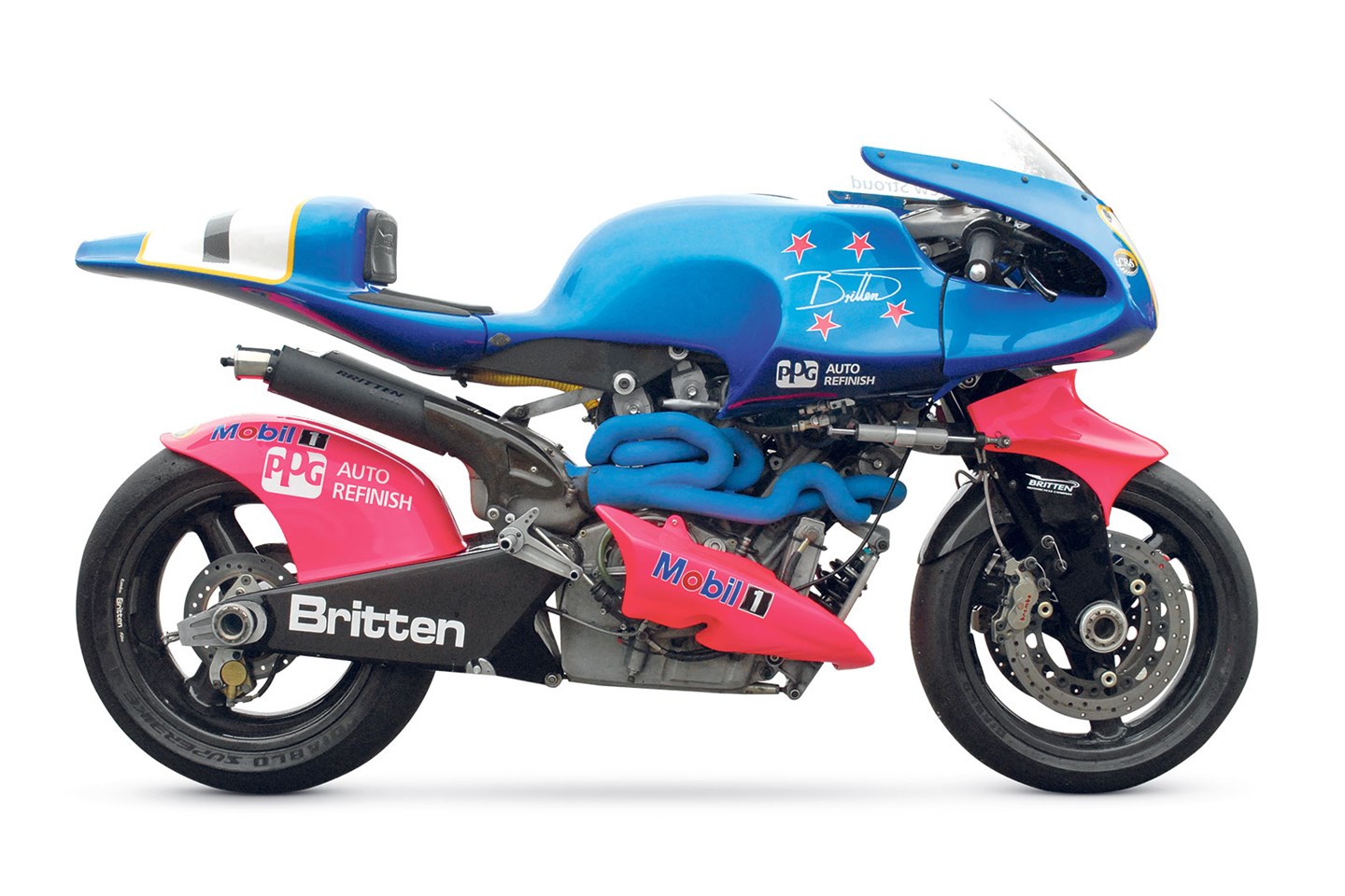 בריטן גם הוסיף מערכת ניהול מנוע שיכולה הייתה לשדר נתונים ולכוון את מערכת הזרקת הדלק דרך מחשב נייד – לא משהו מוכר או מובן מאליו בשנות ה-90. העיצוב היה מיוחד ושונה מכולם, בטח עם שילוב צבעים נועז של כחול-ורוד. ההצלחה במרוצים הייתה מיידית, עם מקומות בפודיום במרוצי הטווינס (BOTT) מול עדר דוקאטי 851, וניצחונות בשנים אחר כך.