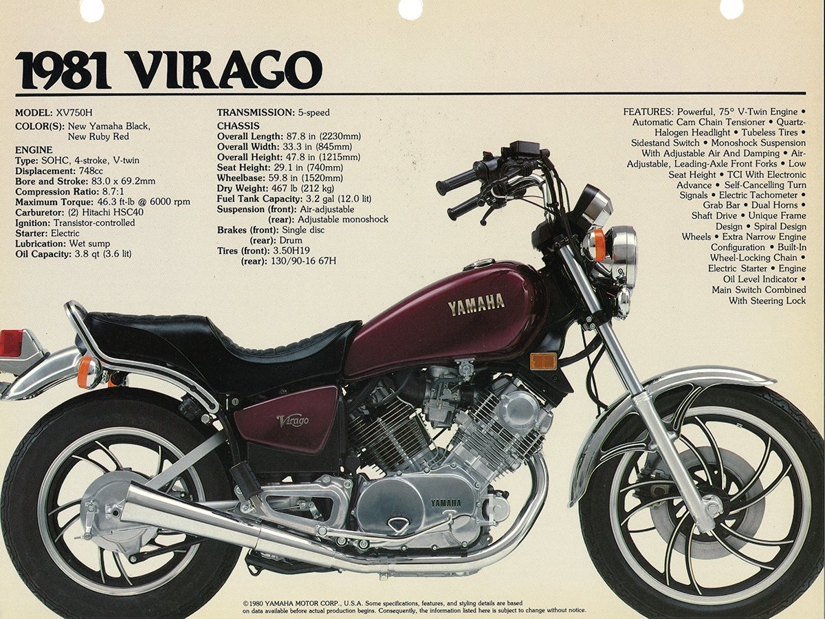 הרעיון היה ברור. בימאהה יצרו אופנוע, שאם תסירו ממנו את הסמל או תבחרו לא להרכיב משקפיים באותו היום, תתבלבלו ותחשבו שעומד מולכם הארלי אותנטי. הגרסה הראשונה של הוויראגו יצאה בשנת 1981 והשוויצה בגאון במנוע וי-טווין מבריק עם 75° בין הצילינדרים, שקוררו על-ידי אוויר. הנפח הראשון היה 750 סמ"ק (748 סמ"ק למדקדקים) עם 55 כוחות סוס ב-7,000 סל"ד ו-6.5 קג"מ ב-5,750 סל"ד. הכוח הועבר אל הגלגל האחורי דרך חמישה הילוכים וגל הינע. המזלג הקדמי היה קונבנציונאלי-דקיק, לא משהו מיוחד. עם הבולם האחורי לעומת זאת, היפנים עשו טעות של טירונים. הם התקינו בולם יחיד – זה מה שהיה לאופנועי ספורט בתחילת שנות ה-80. בשנת 1984 המהנדס פוטר והטעות תוקנה, עם בולם אחורי כפול. החישוקים הגיעו בקוטר 19″ מלפנים (מידת צמיג 100/90) ו-15″ מאחור (130/90). בסיס הגלגלים עמד על 1,520 מ"מ, גובה מושב על 710 מ"מ והמשקל היבש על 225 ק"ג.