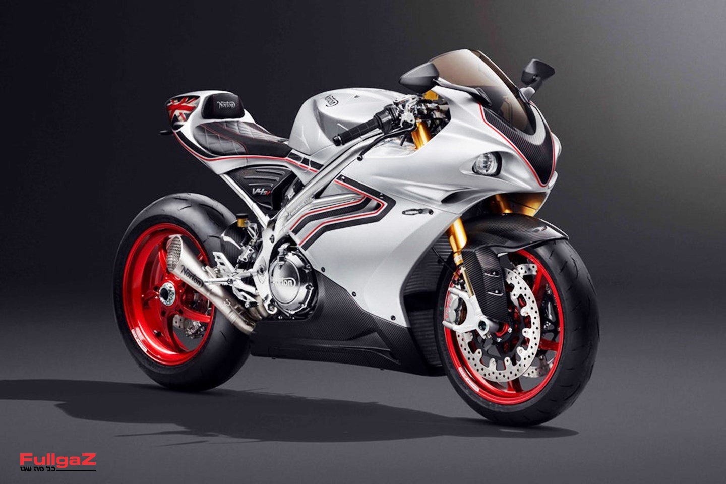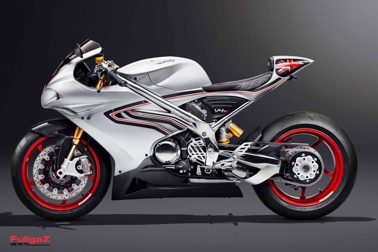 בקפיצה להווה, בנורטון חושפים את התמונות והפרטים הראשונים של דגם הסופרבייק החדש – V4SV. המנוע הוא אותו V4 בנפח 1,200 סמ"ק, כאשר הספקו מופחת במעט ל-185 כ"ס ב-12,500 סל"ד, והמומנט מרשים ועומד על 12.8 קג"מ. השלדה מאלומיניום מלוטש, יש פיירינג מקרבון, בלמי מונובלוק של ברמבו עם דיסקים צפים בקוטר 330 מ"מ, ויש בולמי אוהלינס NIX30 מלפנים ו-TTXGP מאחור.