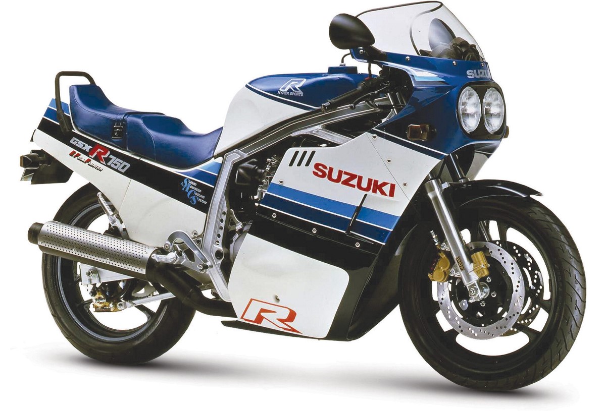 בתערוכת קלן בסוף 1984 הוצג הדגם הראשון, זה שהתחיל את השושלת המפוארת. היום הוא נראה שברירי, אבל בזמנו הוא היה הדבר הכי קרבי שבנמצא. פיירינג מלא, פנסים כפולים, מנוע ארבעה צילינדרים עם הספק של 106 כ"ס על 176 ק"ג משקל יבש. קירור אוויר-שמן והכרזה על הרצון לשלוט בעולם. בשנת 1986 הוצג דגם ה-GSX-R750R המיועד למסלול עם מושב יחיד ובולמים ובלמים משופרים, ואלו הגיעו לגרסה הסדרתית בשנת 1987.