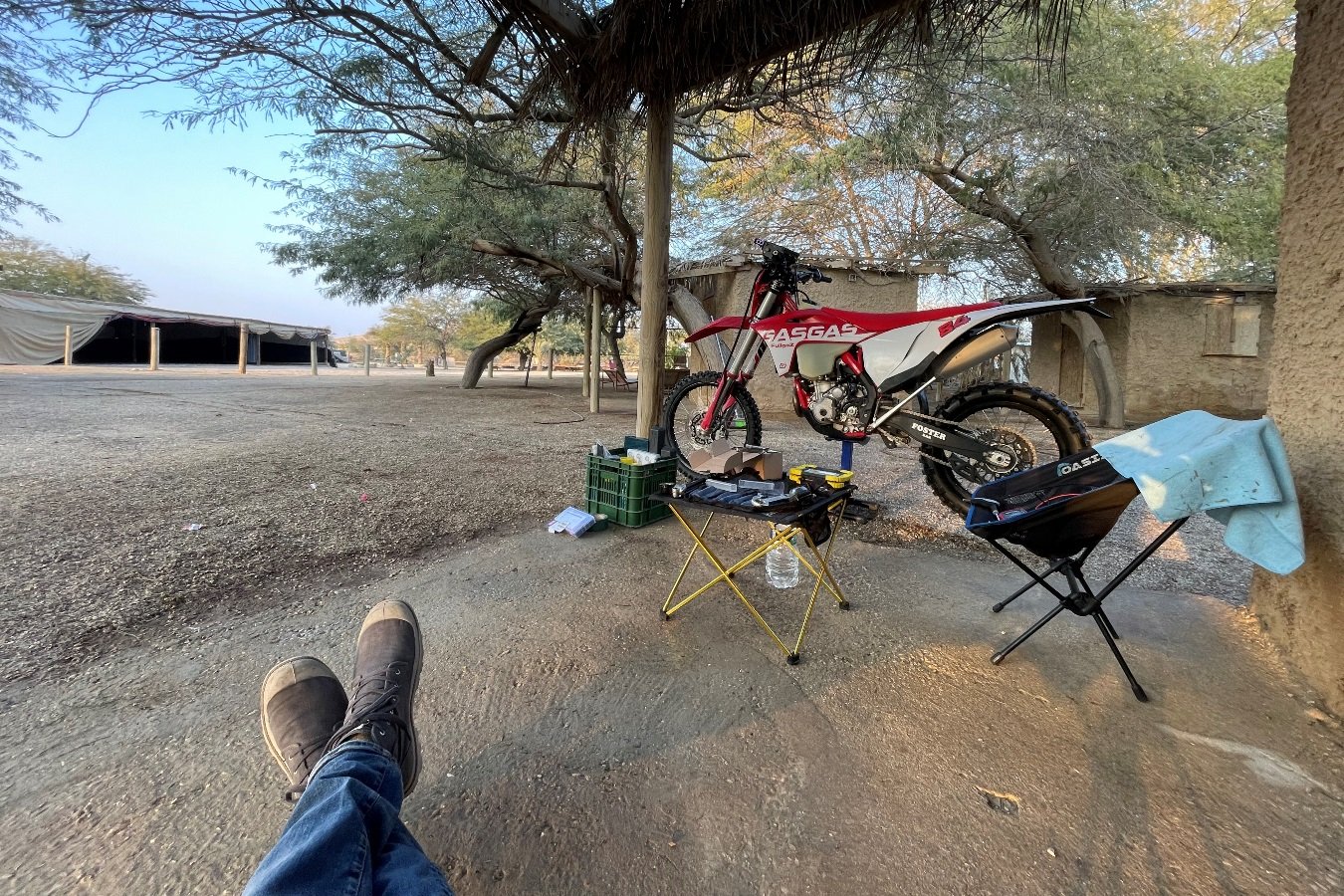 על אף שהראלי עצמו התקיים בימים שישי ושבת, כבר בחמישי הגעתי לחאן ספינת המדבר – עם עוד כמה צוותים שהגיעו יום לפני. בתוך הקהילה הזאת הפרצופים מוכרים, ומי שהיה שם מיד קלט שאני חדש בשכונה. קבלת הפנים הייתה חברית ומזמינה, ומהר מאוד ישבנו סביב המנגל והחבר'ה פינקו בבשר ובטיפים ליום הראשון של הראלי הראשון שלי. באותו הזמן גם אביעד הצטרף. עברנו על האופנוע לוודא שהכל מוכן, ובארוחת הערב דיברנו על אסטרטגיה פיזית ומנטלית ליום המרוץ.