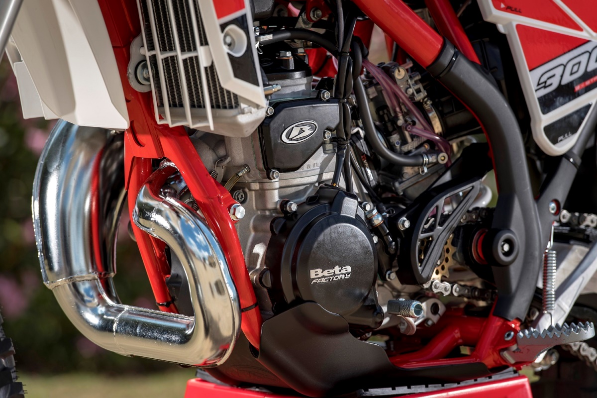 המנוע הוא בבסיסו אותו אחד של דגם ה-300RR, והוא שומר על מידות קוטר קדח ומהלך בוכנה של 72X72 מ"מ, אבל יש בו כמה שינויים קלים. ראשית, יחס הדחיסה נמוך במקצת, הפורטים בצילינדר מתוכננים מעט שונה, אם כי עדיין יש שסתום כוח לפליטה הניתן לכיוונון. אבל הרכיב שעושה את עיקר השינוי בן המנועים הוא סעפת הפליטה היחסית צרה באזור פתח הפליטה. אחד הרכיבים המעניינים בכל הדו-פעימתיים של בטא, וכמובן גם בטריינר, הוא מערבל השמן המובנה הממוקם מתחת לכיסא (ונפתח בלחיצת כפתור), המכיל כ-650 מיליליטר של שמן דו-פעימתי שאמור להספיק ללא מעט תדלוקים מפנקים בתחנת הדלק ללא כל צורך לחשב או לזכור את כמות השמן. חישוב השמן המוזרק ישירות לסעפת היניקה נעשה על ידי משאבת השמן בעזרת נתוני סל"ד הניתנים מה-CDI ומחיישן מצב מצערת הממוקם על הקרבורטור. מיכל הדלק מכיל 8.5 ליטר, כשמתוכם 1.5 כרזרבי, ומערכת הקירור מכילה 1.3 ליטר של נוזל קירור.