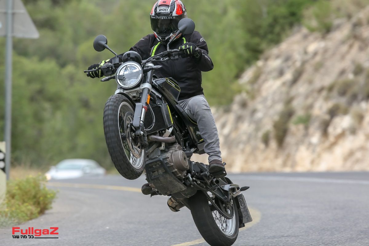 ההתנהגות הדינמית עומדת בקו אחד עם המנוע הכיפי. השלדה קשיחה ועומדת בעומסים של רוכבים כמונו, שאוהבים לדחוף את האופנועים לקצה וגם לבצע עליהם פעלולי סטאנטס. המתלים, על אף היותר רכים, משלבים היטב ספיגה ונוחות עם ספורטיביות ויציבות, וכמו ברוב האופנועים של יצרנית האם – הם גם מאפשרים עבודה תלת-ממדית עם האופנוע, וזה ממש כיף. במיוחד כשזה על אופנוע רטרו. גם הבלמים טובים ואף יותר.