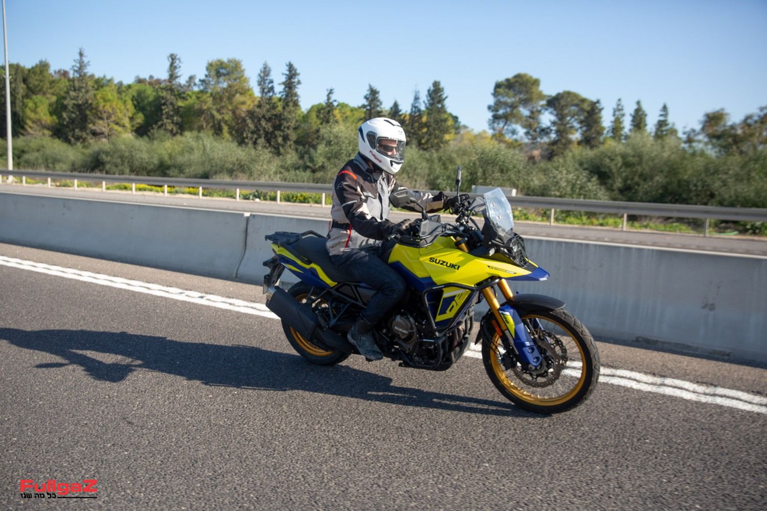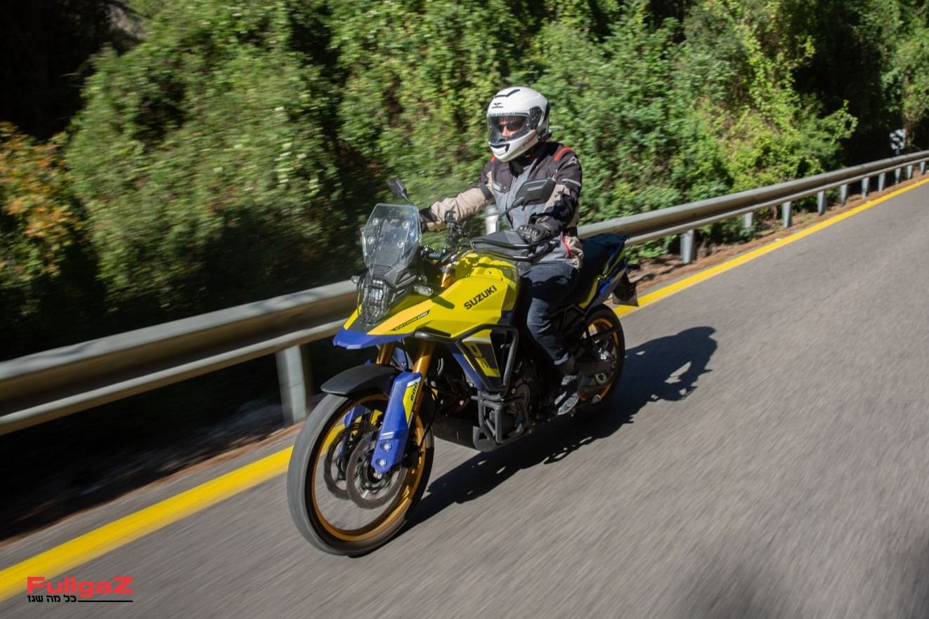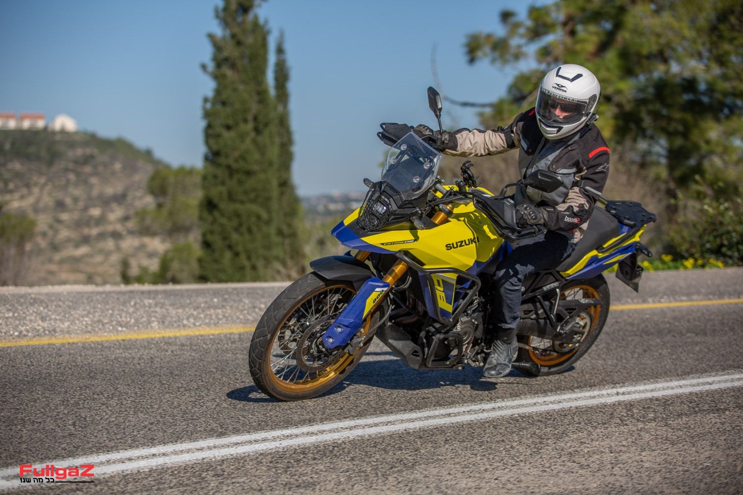 צמיגי הדאנלופ עשו עבודה מעולה בכביש, אבל המחיר לכך הוא פגיעה ביכולות השטח. ניסיון לעלות עלייה ארוכה ולחה נעצרה בגלל חוסר אחיזה של הצמיג האחורי, ולא משנה באיזה מצב מנוע בחרנו. מי שיבחר לרכוב יותר בשטח יידרש לצמיגים אחרים. במערכת ניהול המנוע ניתן להיכנס למצב 'G', כלומר GRAVEL או עפר, שמעדן את תגובות המנוע ואת בקרת האחיזה לטובת השליטה על מצע חלק. אנחנו כהרגלנו העדפנו להשאיר את המנוע על המצב החזק ולנתק את כל הבקרות. כמובן שצריך לתאם ציפיות מראש (כמו עם רוב האדוונצ'רים) ולהבין שלא מדובר על אופנועי שטח טהורים. ניתן לטוס על שבילים וליהנות מיכולות השלדה והמנוע, אבל שטח מאתגר יותר כבר לא יתאים לסוזוקי. כך או כך, הוא הרבה יותר טוב מהוויסטרום 650 בכל מקום בו תרכבו.