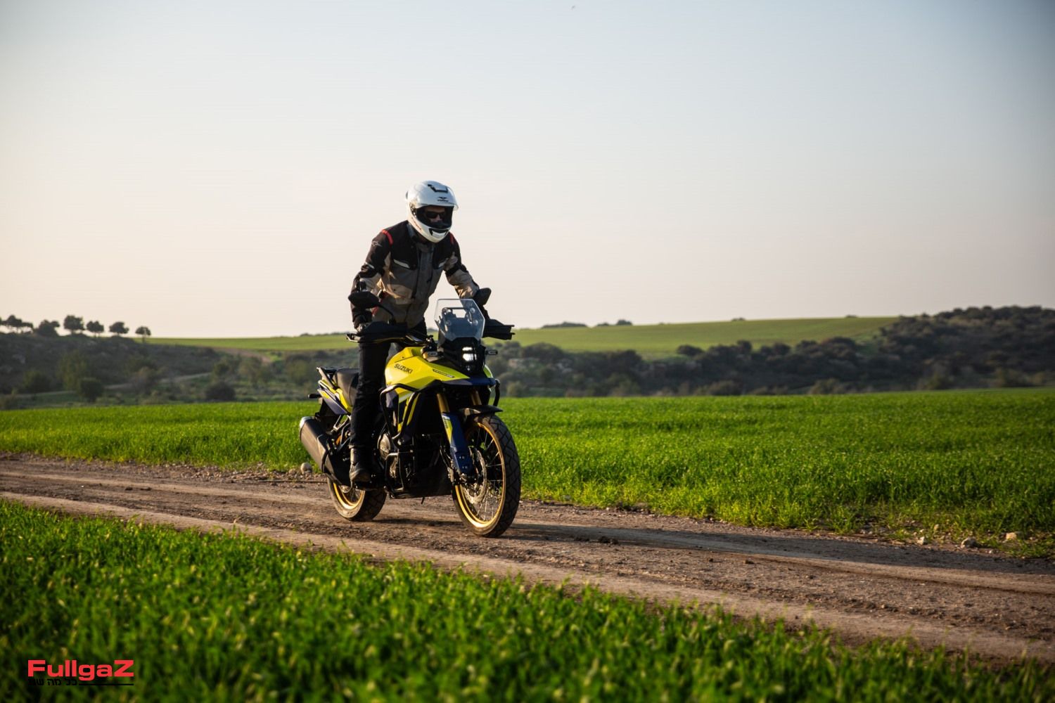 התחושה מהבולמים מפריעה מעט יותר בשטח, שם החריצים הקטנים יכולים לעייף יותר את הרוכב בגלל הנוקשות היחסית שמועברת לידיים דרך הכידון. ניתן לרכך אותם במעט, אבל אז זה יפריע כשהקצב יעלה. כמובן שעם 230 ק"ג אין כאן שום כוונה לכבוש סינגלים, סלעים ודרופים, כאשר איזור הנוחות של הסוזוקי נמצא בשבילים, כמו עם רוב המתחרים שלו. נקודת התורפה העיקרית שלו באה לידי ביטוי בצמיגי הכביש איתם הוא מגיע שמגבילים אותו בשטח.