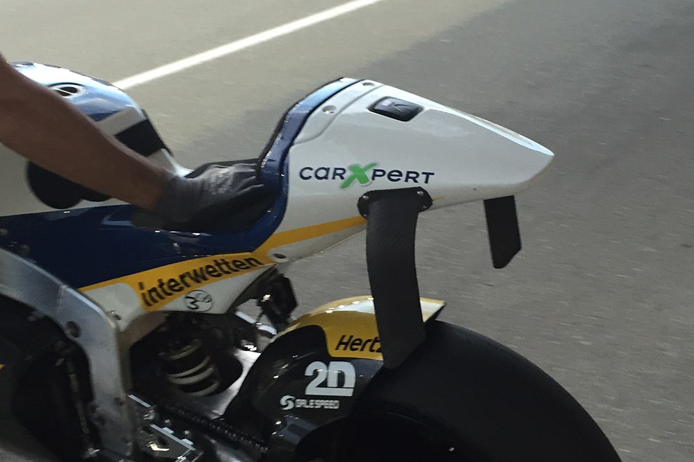 כעת מגיעות התמונות האלו מימי המבחן של קטגוריית ה-Moto2 בקטאר, של הרוכב השוויצרי דומיניק אגרטר מקבוצת Technomag-Interwetten. כפי שעיניכם רואות, הפעם הכנפונים מגיעים דווקא מאחור, ולא מדובר בדיוק בכנפונים יען כי אין תפקידם להצמיד את האופנוע לקרקע כפי שקורה בקטגוריה הבכירה. מטרת ה'חרבות' הללו שונה לחלוטין והיא 'ללכלך' את האוויר שמאחורי האופנוע.