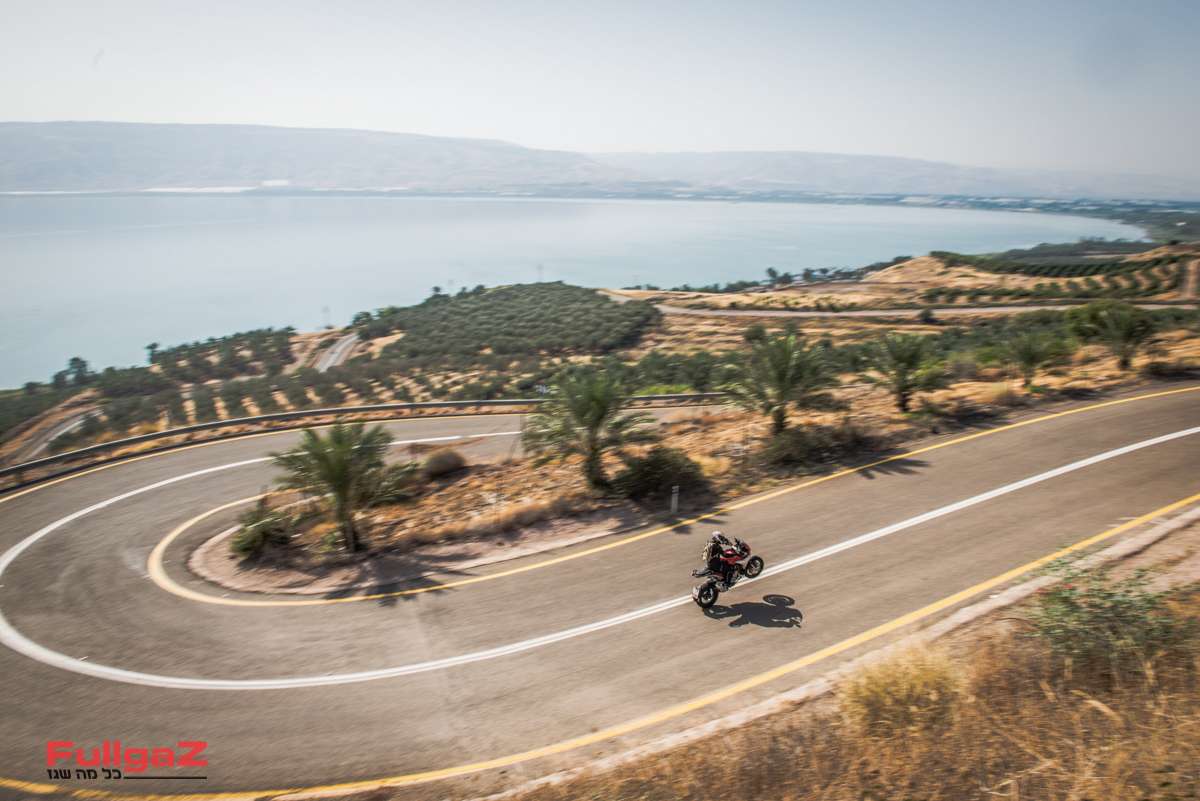 אנחנו קצת אחרי צמח, מתקדמים מזרחה. בעוד רגע יתחיל קטע החימום שלפני העליות מחמת גדר אל מבוא חמה. זה קטע מגוון מאוד, טכני, אבל לא צפוף מדי, שכולל פניות מכל הסוגים והמון שינויי כיוון ולא נותן בהכרח יתרון מסוים לאף אחד מהאופנועים. זה אמנם קטע חימום קצר יחסית, אבל מדובר באחד הקטעים המגניבים ביותר בארץ בעיניי. שמאל, ימין, שמאל, ימין – בלי הפסקה, עם אספלט ושיפועים נכונים שמאפשרים לדחוף כמויות של גז, וה-S1000R יוצא מהפניות עם דרייב בלתי נגמר, גלגל שמתרומם כשאנחנו בהטיה שמאלה ונוחת חזרה כשאנחנו כבר נכנסים לפנייה ימינה.