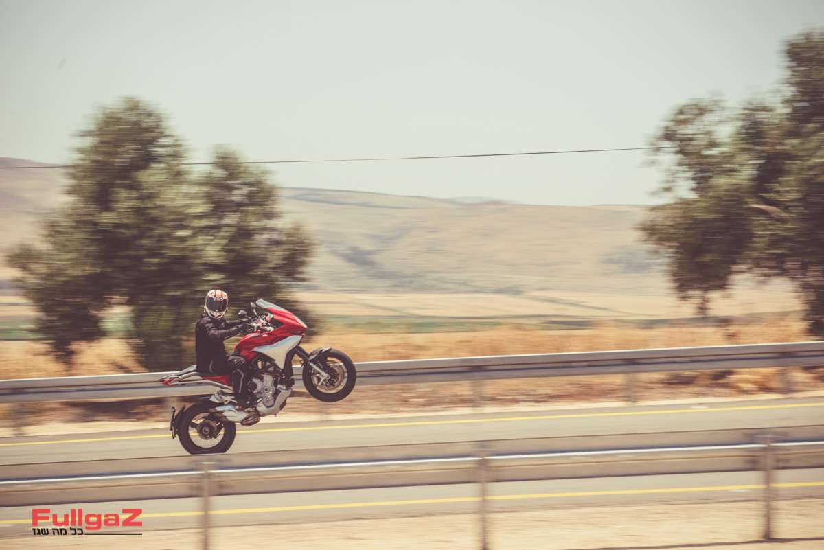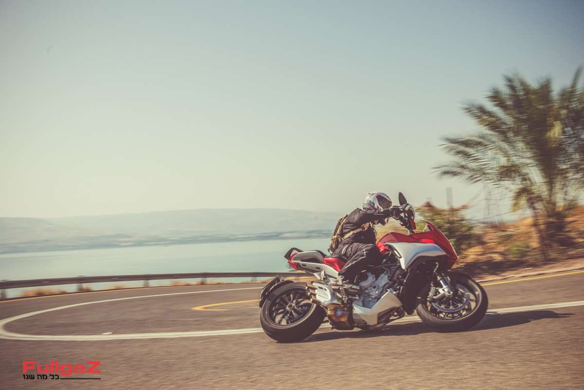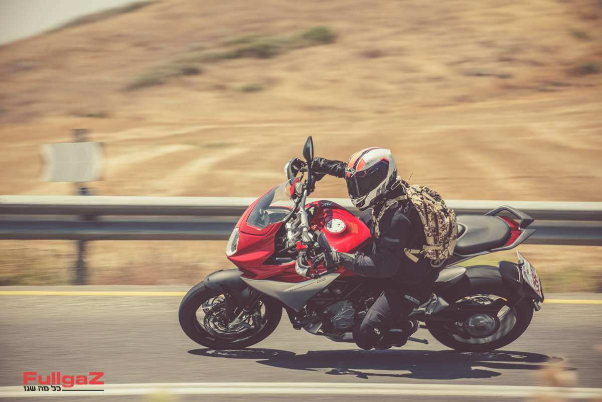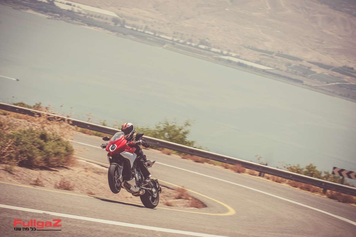 בדרכנו צפונה אל הכנרת, כביש 90 נפתח אל סדרה בלתי נגמרת של סוויפרים ארוכים ומהירים על אספלט מעולה. בדיוק המקום לעזוב את אביעד והק.ט.מ ולתת דרור למנועים שמורידים לכביש 148 כוחות סוס במקרה של ה-F3 ו-160 במקרה של ה-S1000R. אני יושב על הזנב של נמרוד ושומע דרך הסקאלה ריידר PACKTALK איך אביעד מתרחק ומתנתק ואת צעקות האושר של נמרוד שמתורגמות לדרך שבה הוא זז על האופנוע, מרים, מוריד, דוחף. הוא זרע בדמעה כל הדרך וגם עכשיו הוא עובד קשה, אבל סוף סוף הוא קוצר. הוא מתאר לי באוזנייה כל פעולה שהוא עושה ואיך האופנוע מגיב בצורה שהוא לא חווה על אף אופנוע לפני זה. זה גם ניכר בעין ככל שהמהירות והעומסים עולים, ונראה שה-MV אגוסטה יותר ויותר מתיישב לתוך ה'זון' שלו.
