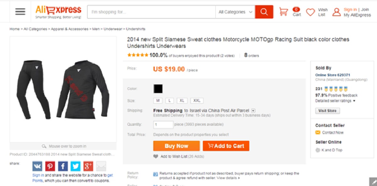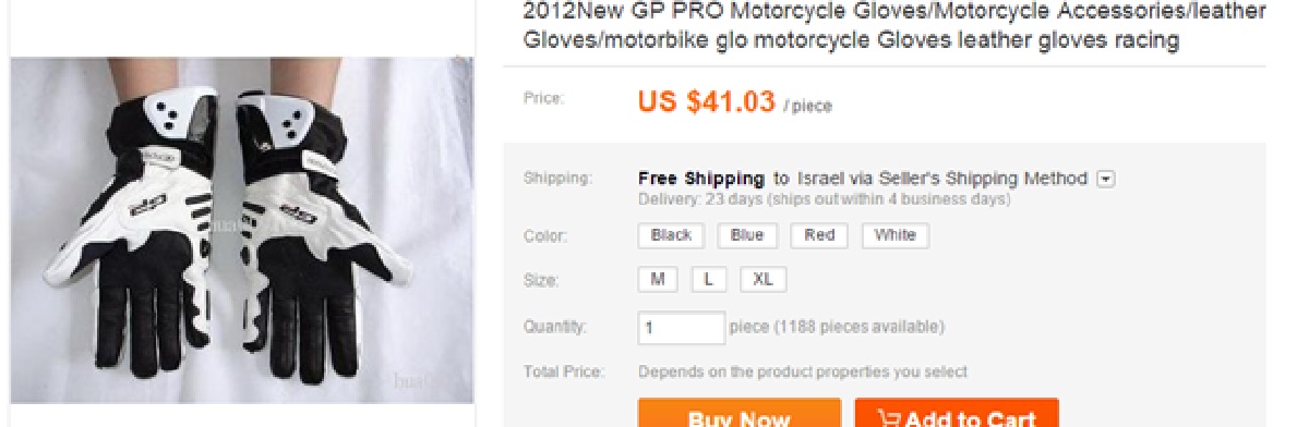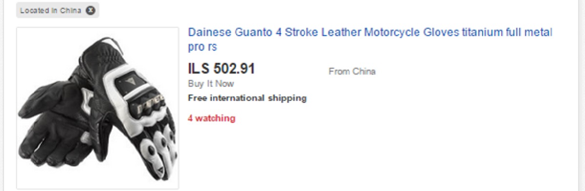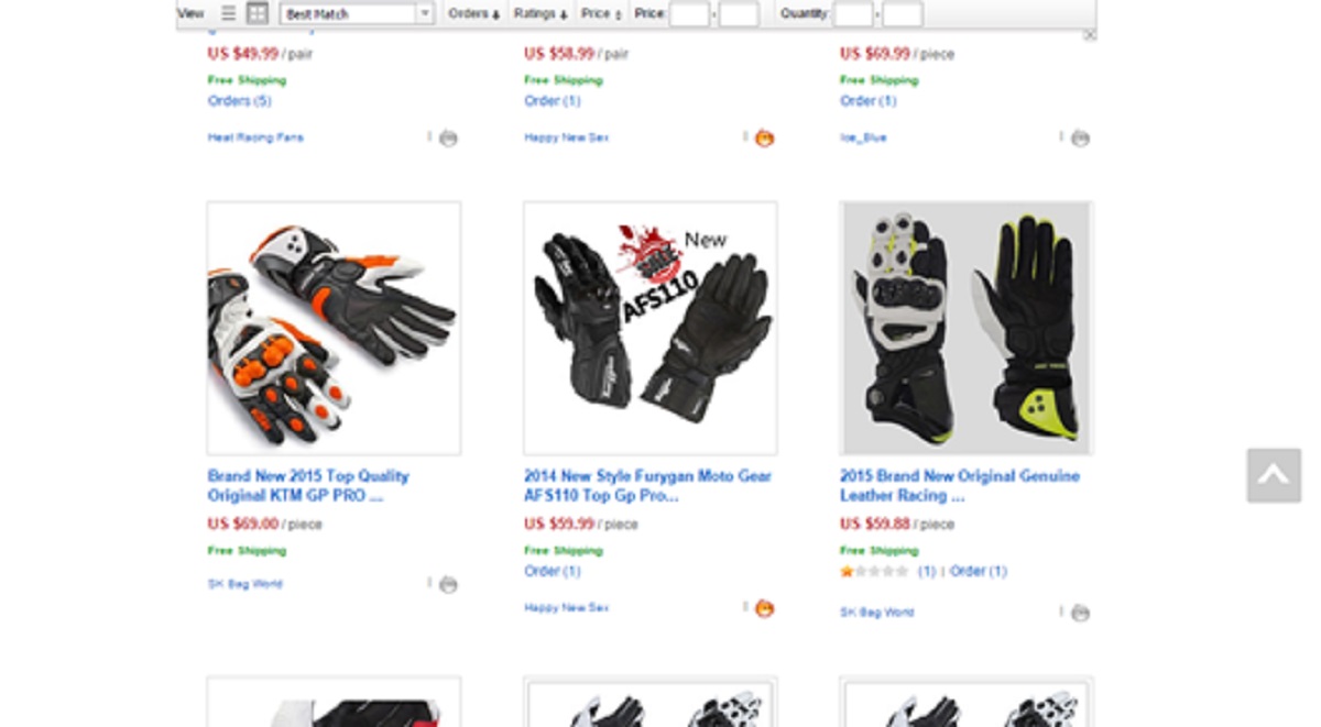 למען הכתבה יצאנו לתור באתרים הסיניים וחיפשנו ציוד רכיבה. בהתחלה חיפשנו מילים כלליות כמו 'כפפות אופנוע', אבל האמת שגם חיפוש של דגמים ספציפיים מעלה תוצאות, ובפרט כאן אפשר לראות את מה שהיא ככל הנראה הכפפה שמחקים הכי הרבה בעולם – האלפינסטארס GP PRO. היות ועל הדגם הזה נכתבו הררי מילים, רצינו בכתבה זו להתמקד בכפפה אחרת, כדי להראות שיש כפפות חיקוי מכל המותגים.