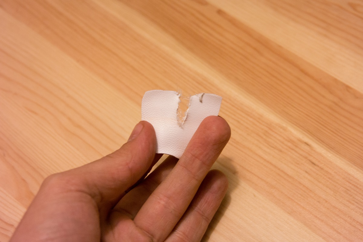 נחזור לכפפות עליהן דיברנו בתחילת הכתבה. הן לא עשויות עור. לצורך ההדגמה חתכנו פיסה מהעור של הככפה. בצידה השני התגלתה רשת בד פשוטה. בסך הכל כל הקונסטרוקציה הזאת של העור נראית כאילו לקחו בד עדין ושפכו עליו פלסטיק.