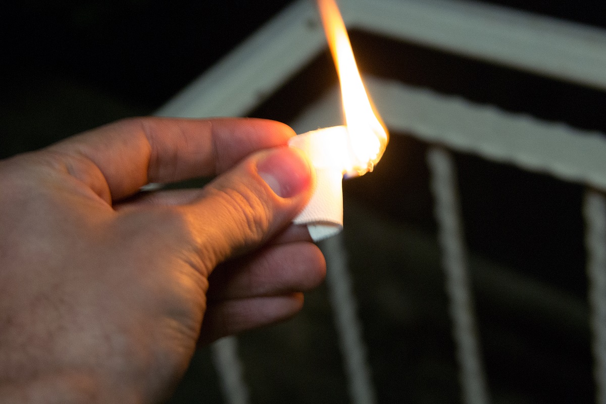 אז הצתנו את חתיכת העור הזאת. עור רגיל יתחמם, יתעוות, ולבסוף ייהרס, אבל עדיין ישמור על השלמות שלו. מה קרה כשהדלקנו את החתיכה הזאת? ה'עור' הזה לא החתמם, לא שינה צבע, לא נהרס. הוא נדלק כמעט בצורה מיידית. הוא בער כמו חוט שפצור, כל כך מהר שבקושי הספקנו לצלם לפני שהחום הגיע לאצבעות.
