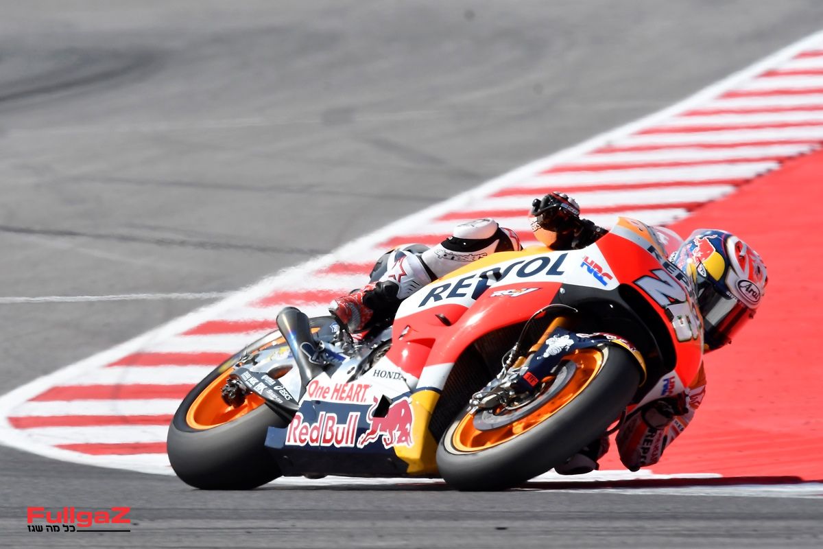 החוד מתייצב כשבראש רוסי מוביל על לורנזו ב-0.8 שניות ומרקז מפגר אחרי לורנזו בזמן זהה. פדרוסה ברביעי נכנס לקצב, והחל מההקפה ה-12 הוא קובע זמני הקפה מהירים משל מרקז, לורנזו ורוסי ומתחיל לצוד אותם לפי הסדר. מרקז נופל לידי פדרוסה בהקפה ה-14. פדרוסה אולי מתקשה בדרייב ביציאה מפנייה 10, אבל הוא מנצל את הצמיג הקדמי הרך כדי לצבור מהירות מסחררת ברצף פניות ימניות שמאפשרת לו עקיפה קלה בימנית ההדוקה בפנייה 14. פדרוסה נח הקפה בודדת ואז מבצע את אותו התרגיל ללורנזו.