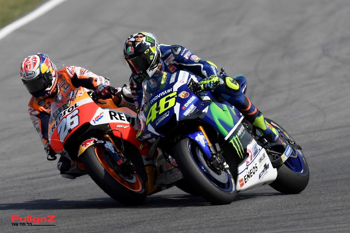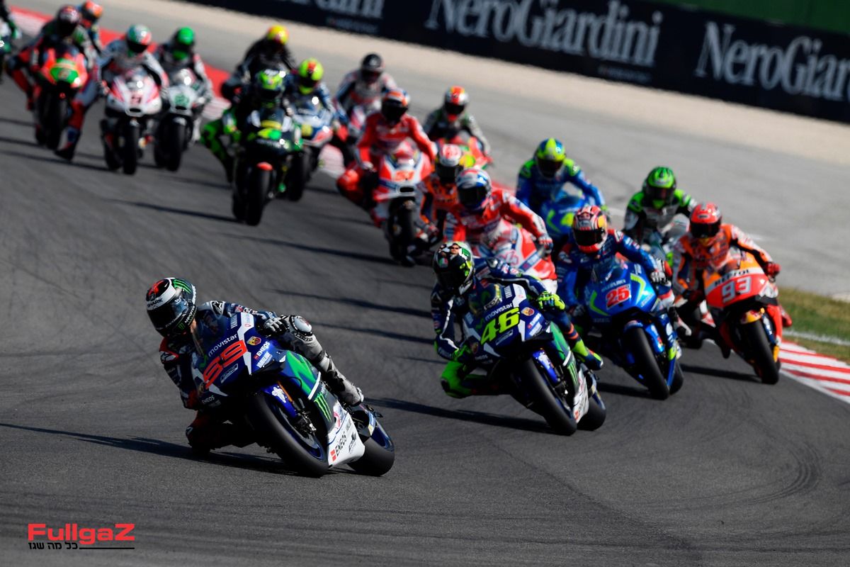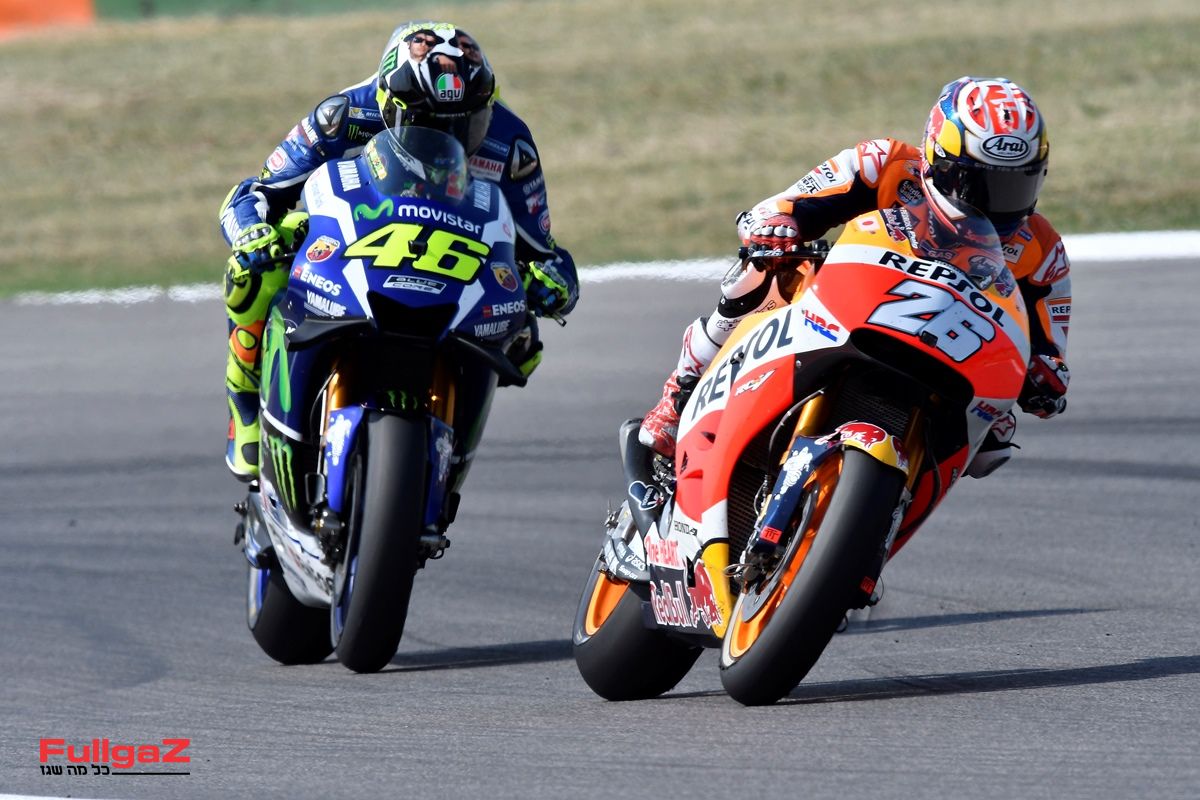 השורה הראשונה על הגריד מזנקת היטב. כך גם השורה השנייה, ורבים מהרוכבים שומרים על מיקומם. פדרוסה מזנק מהמקום השמיני היישר אל המקום השישי, והיה משפר עוד יותר ללא רצף הפניות ההדוק מיד בתחילת ההקפה. לורנזו, שזינק מפול פוזישן, מצליח לזכות בהולשוט כשהוא יוצא ראשון מפנייה 1. רוסי מאבד מקום לויניאלס, שסוגר את הקו הפנימי לרוסי בפנייה 1 רק בשביל לגלות שביציאה רוסי ממוקם על הקו הפנימי לפנייה 2. רוסי ממהר לסגור את הפער על לורנזו. בשנים עברו, לורנזו היה נעלם אל האופק ומשאיר לשאר הרוכבים להתקוטט מאחור. לא ב-2016. רוסי נצמד ללורנזו במהלך ההקפה הראשונה ומלווה אותו עד לכניסה לפנייה 14 בהקפה השנייה. רוסי נכנס לפנייה אגרסיבי, ובסוג של בלוק-פס הוא מכריח את לורנזו לזקוף את האופנוע ולוותר על המקום. מרקז מנסה לעקוף את ויניאלס מספר פעמים, כשבהקפה הרביעית הניסיון צולח. ויניאלס, שאיבד מומנטום, מאבד מקום גם לדובי ונסוג משלישי לחמישי תוך מספר פניות, ומקום נוסף לפדרוסה הקפה אחת לאחר מכן.