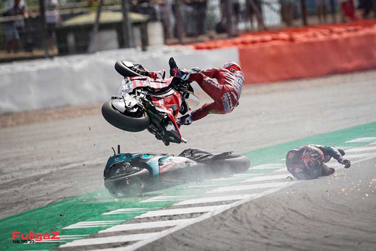 מזנקים אל הפנייה הראשונה. מרקז מזנק היטב, ואחריו צוללים לפנייה הראשונה רוסי ורינס. קוארטררו סוגר גז כשרינס חווה אובדן אחיזה רגעי. קוארטררו מנסה לפצות בפתיחת מצערת לרווחה, אבל מעט מוקדם מדי וחזק מדי לצמיגים קרים והימאהה עונה בלשגר את פאביו מעבר להייסייד. דובי, שמנצל במלואו את מתקן הזינוק של הדוקאטי GP19, מגיע כטיל לפנייה 1 וממריא אל-על כשהוא פוגש את הימאהה של קבוצת הלוויין פטרונאס שמחליק אל צידי המסלול.