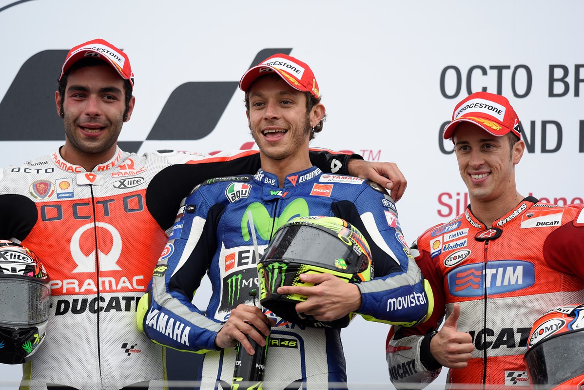 25 רוכבים מונה הגריד של ה-MotoGP, מתוכם רק שישה רוכבים מחזיקים באמתחתם ניצחון במרוץ MotoGP. דובי ניצח מרוץ אחד מוכה גשם בדונינגטון, היידן ניצח שלושה מרוצים מתוכם שניים בלגונה סקה ואחד שייזכר לדורות באסן, כשקולין אדוארדס מתרסק בשיקיין האחרון. רוסי מחזיק ב-86 ניצחונות, לורנזו ב-38 ניצחונות, פדרוסה ב-26 ניצחונות ומרקז ב-22 ניצחונות. לזינוק בסילברסטון עמדו שלושה רוכבים עם סיכוי לאליפות: לורנזו – מוביל הטבלה, רוסי – עם מספר נקודות זהה, ומרקז שמפגר ב-52 נקודות אחרי צמד הרוכבים של ימאהה. השלישייה המדוברת מתחלקת לשני סגנונות שונים בדרך לנצח מרוצים. רוסי ומרקז מצד אחד ולורנזו בקצה השני של הסקאלה. באליפות כל כך צמודה, האופן בו המתמודדים נוהגים לנצח מרוצים עלול להיות משמעותי לגורל האליפות. לורנזו מחזיק ב-38 ניצחונות, רובם הושגו בסבבים מושלמים בהם לורנזו שלט במקצי האימון, הדירוג והמרוץ עצמו, וכמעט חצי מניצחונותיו הושגו כשהוא מוביל החל מהפנייה הראשונה ועד דגל השחמט. מנגד, רוסי את מרקז נוהגים לנצח מרוצים גם בסבבים שרחוקים מלהיות מושלמים. מרקז אמנם מדרג טוב מרוסי, אבל לשניהם יש קושי בזינוק. רוסי ומרקז שניהם ניצחו רק שני מרוצים כל אחד בהם הם הובילו מהפנייה הראשונה ועד דגל השחמט. בתנאים מיטביים לורנזו, כמעט, אינו ניתן לעצירה. בתנאים אחרים לורנזו מתקשה, בעוד רוסי ומרקז פורחים.
