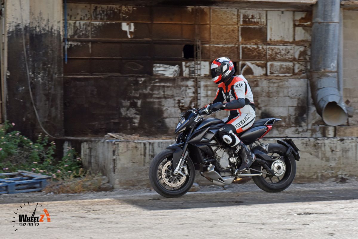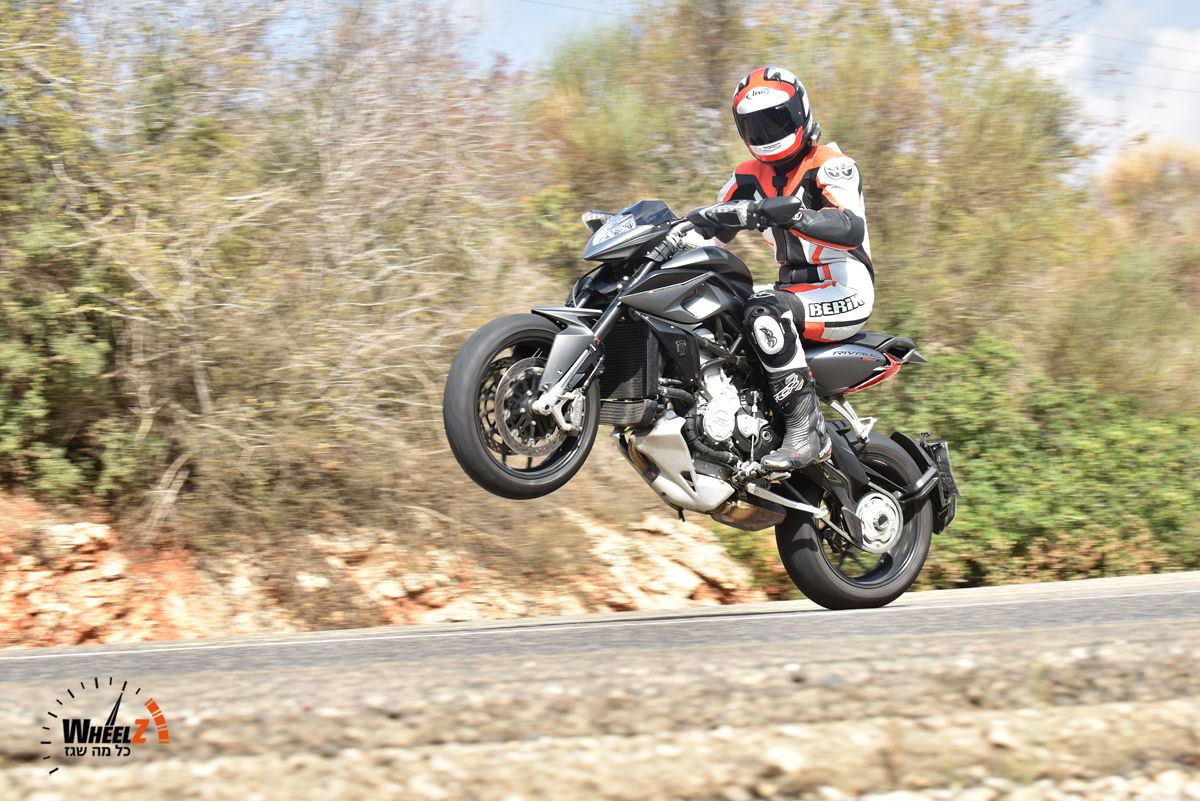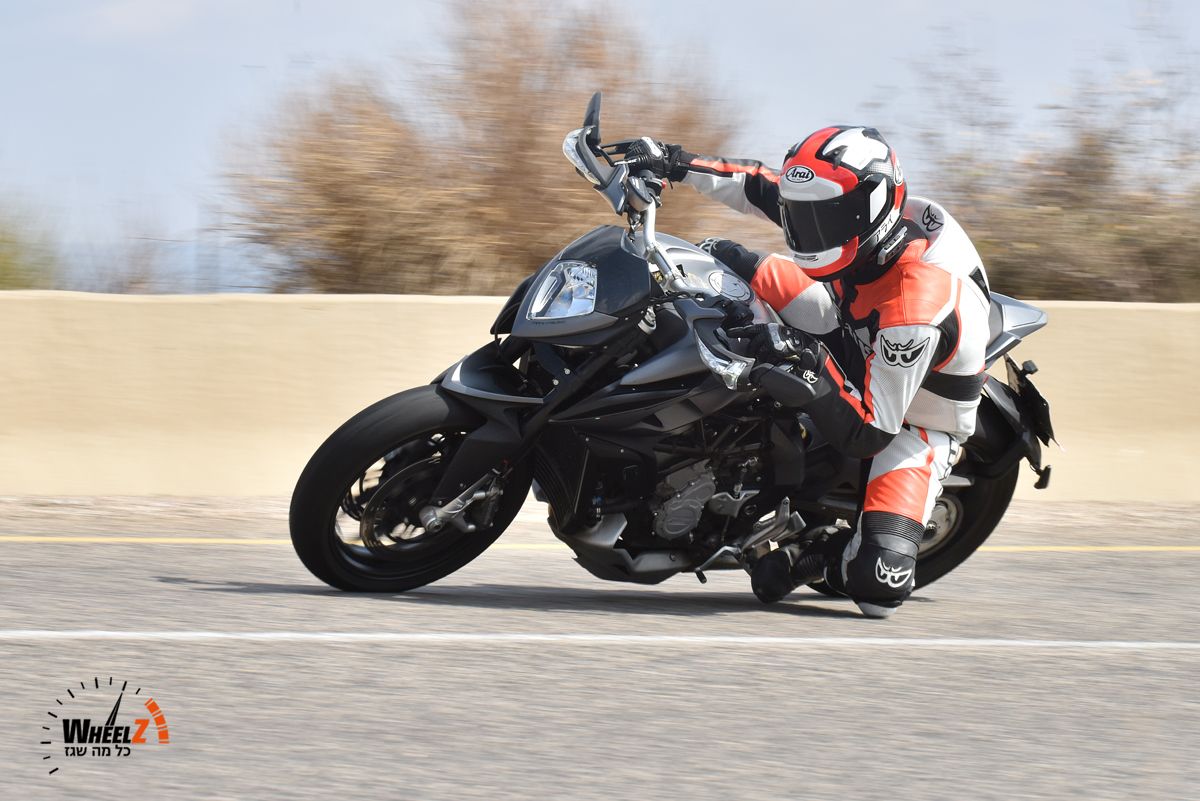 מנוע הטריפל בנפח 789 סמ"ק מכיל שלוש בוכנות שצריכות לרוץ על מהלך קצרצר של 54.3 מ"מ, וזה אומר שהאופנוע הזה חובב סל"ד. אופנוע היפרמוטו שמגיע לשיא ההספק ב-12,000 סל"ד זה כבר מעניין, בטח כשיש 125 כ"ס לנצל. עכשיו שלבו את המידות של האופנוע, שמתבטאות גם בבסיס גלגלים קצרצר של 1,410 מ"מ, ותקבלו אופנוע שלא ממש דואג להישאר עם האף למטה בפתיחות גז. אם אתם בעניין של ווילי יזום, אז יש פה נקודת איזון מאוד גבוהה ומנוע שרק מחכה להגיע לסל"ד מספיק גבוה כדי להתפוצץ, וכשזה קורה – הפוטנציאל שלכם להיות על הגב גבוה מאוד. מנגד, המנוע כל כך חזק שאפשר להישאר עם גלגל באוויר רק על כוח המנוע, וכשמבינים את זה קשה להפסיק.