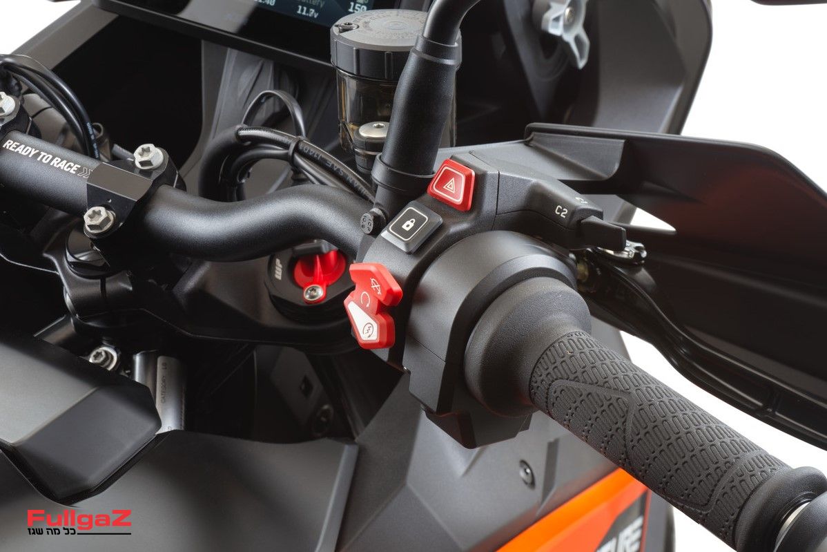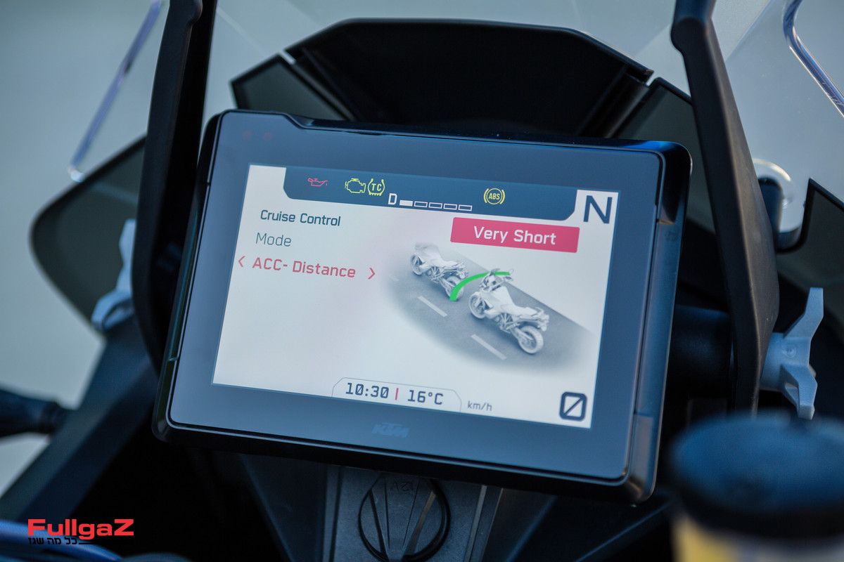 מסך ה-TFT הצבעוני מצוין, מציג שפע של מידע ונתונים, נשלט מבית המתגים השמאלי – כמו בכל דגמי ק.ט.מ המצוידים בו, ויש לו פיצ'רים מעניינים כמו החלפת קוטביות כאשר עוברים מאור לחושך. מצוין. גם השליטה במצב ניהול המנוע ומצב ניהול האופנוע (בקרת אחיזה, ABS) מתבצע כולו מהמסך ומבית המתגים בקלות ובאינטואיטיביות עם ממשק משתמש מצוין. בנוסף, בק.ט.מ מציעים את התוסף והאפליקציה My Ride, שמתממשקים לטלפון הנייד. החיסרון היחיד של מסך ה-TFT, שעליו כבר דיברנו, הוא מד הדלק, שמציג רק אח החצי השני של הדלק במיכל, כשזה אילוץ הנובע ממבנה מיכל הדלק – שיורד עד לחלקו התחתון של האופנוע משני צידיו.