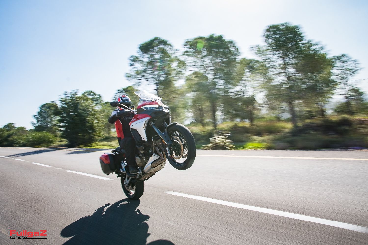 דגמי המולטיסטראדה תמיד היו בעלי ביצועי כביש ברמה גבוהה, אולם ה-V4 לוקח את הביצועים צעד אחד קדימה. זה מתחיל במנוע ה-V4 המצוין. הוא אמנם חזק מאוד, ואם פותחים גז חזק במעלה הסל"ד מקבלים תאוצות אדירות (בין היתר בגלל הגיר הקצר) עד 250 קמ"ש, אולם הסיפור פה הוא המומנט השטוח שמאפשר טווח שימושיות רחב מאוד ונותן תחושה מעולה גם בסל"ד נמוך ובינוני. כך למשל ניתן להיכנס לכיכר בהילוך שלישי במהירויות נמוכות ובסל"ד נמוך, ולצאת החוצה על הגז ללא הצורך להוריד הילוך. המנוע יספק במקרה כזה תאוצה אחידה וחלקה, שימושית מאוד. זה אחד המנועים הטובים של דוקאטי, ובבולוניה עשו עבודה מעולה בהתאמת הגרנטוריזמו למולטיסטראדה V4.