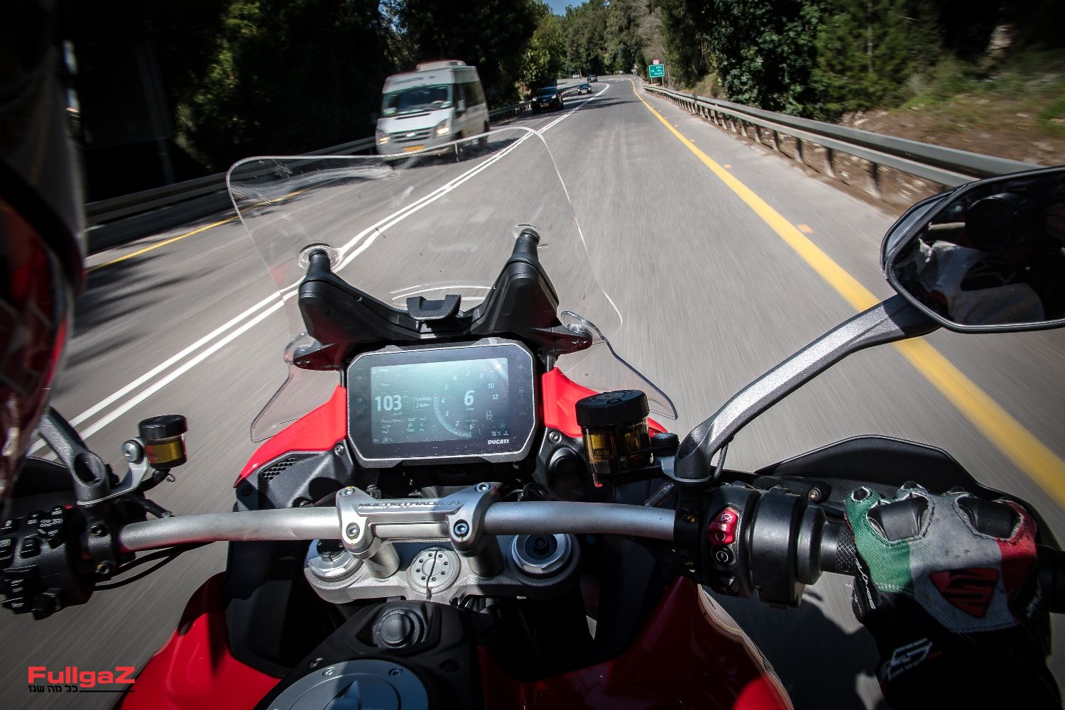 מיגון הרוח מעולה, ומעבר לפרקטיות של שינוי גובה המשקף עם יד אחת, בדוקאטי יצרו כונסי אוויר מסביב לאופנוע – מחלקו התחתון של המשקף ועד רגלי הרוכב – שמתעלים את האוויר מסביב לרוכב, כך שאין מערבולות רוח כלל. בנוסף, הרדיאטורים מופנים לצדדים, מעבר לרגלי הרוכב, ויש שתי תעלות שמזרימות אוויר טרי אל רגלי הרוכב. התוצאה: אין זרימה של חום אל רגלי הרוכב, גם לא ברכיבה עירונית. מצוין! בנוסף, איכות החומרים, ההרכבה והגימור הן מהגבוהות ביותר שיש, והמולטיסטראדה V4 נותן תחושה של אופנוע מהודק ומהוקצע. קפיצת מדרגה משמעותית עשו בדוקטי בשנים האחרונות בתחום הזה, כשכאן במולטיסטראדה V4 התחושה היא של מוצר פרימיום ברמה הגבוהה ביותר.