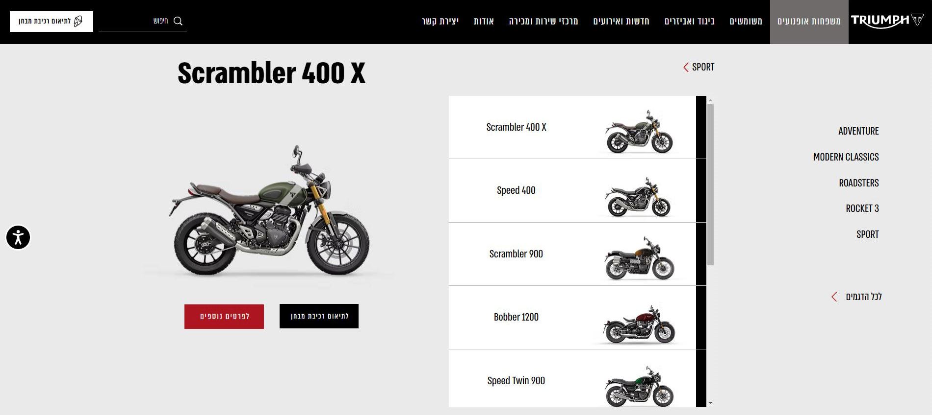 באתר החדש תמצאו מידע מקיף על כל דגמי טריומף המגיעים לישראל, כולל מפרטים טכניים, גלריות תמונות ומחירים לדגמים ולתתי הדגמים, וכמובן אפשרות לתיאום רכיבת מבחן. פרט לכך תמצאו באתר מידע על אופנועים משומשים העומדים למכירה אצל יבואנית טריומף, אלבר מוטו, מידע על ביגוד ממותג טריומף ואביזרים נלווים לאופנוע – מקוריים של טריומף, מידע על מרכזי שירות ומכירה של טריומף ברחבי הארץ, וכן תוכן חדשותי ואירועים בהפקת טריומף ישראל.