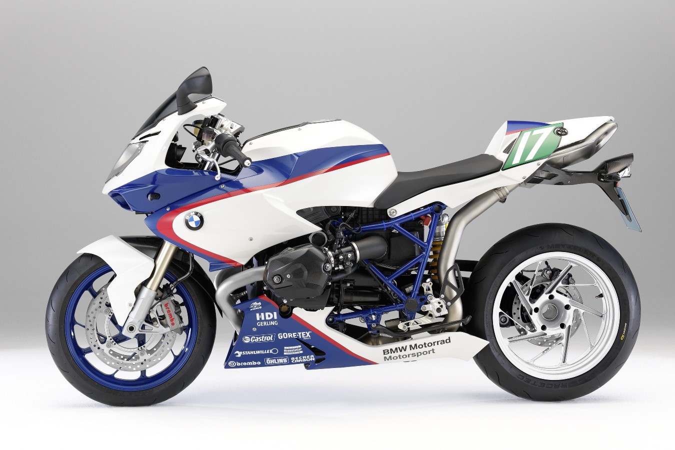 שימו לב לעיצוב הלא אופייני לב.מ.וו, בטח אז. מושב יחיד, אגזוז מתחת למושב היחיד, זרוע אחורית חד-צידית, מעטפת פיירינג מקרבון, חישוקי אלומיניום מחושל בקוטר 17″ עם צמיגי מצלר דביקים במידות 120/70 מלפנים ו-190/55 מאחור.