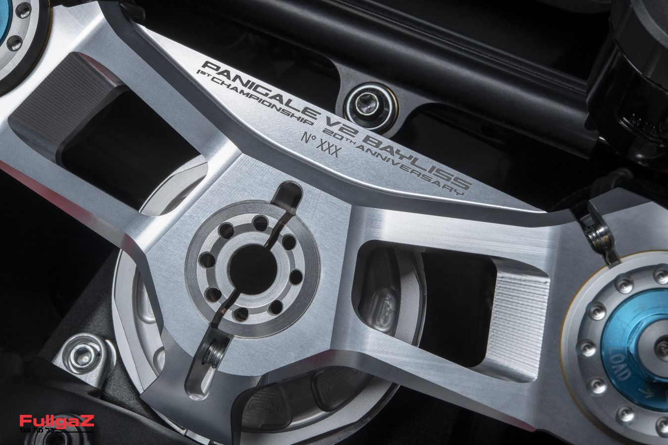 הפניגאלה V2 בייליס מגיע בצביעה מיוחדת המזכירה את ה-996R מ-2001, כולל מספר הרוכב של בייליס – 21 (על אף שתקופה מסוימת הוא רכב עם המספר 12). מערכת המתלים מקבלת שדרוג משמעותי עם מזלג אוהלינס NIX30 יוקרתי ובולם TTX36 מאחור. טכנולוגיית ה-TTX של אוהלינס מונעת את הוואקום הנוצר בחלק התחתון של הבוכנה בבולם בעת דחיסה מהירה, ולמעשה שומרת על לחצים כמעט קבועים בגוף הבולם – מעל ומתחת לבוכנה. המשמעות – פחות התנגדות לפעולת הבולם. בנוסף, יש מצבר ליתיום-יון קל יותר ומושב יחיד המפחיתים 3 ק"ג מהמשקל הסופי. כל דגם יגיע ממוספר, ועם החתימה של טרוי בייליס.